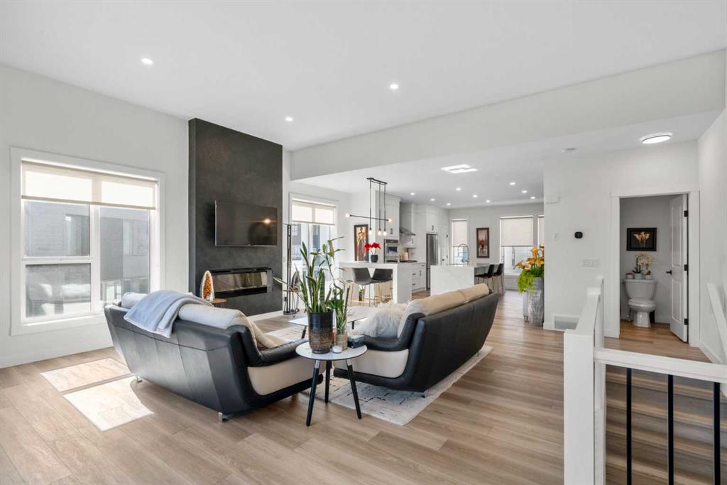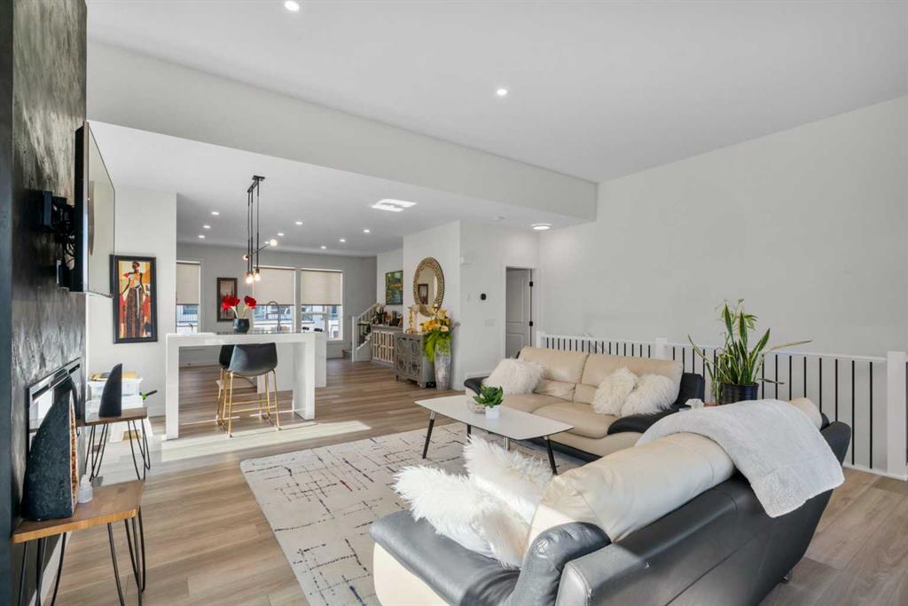 Perched atop one of the highest points in Crown Park, this striking Stanley plan walkout end unit townhome offers a rare combination of contemporary sophistication, exceptional functionality & sweeping downtown skyline views, making it a standout opportunity in Calgary’s premier urban communities. Boasting 2274 square feet of exquisitely upgraded living space & over $55,000 in thoughtful enhancements, this home is perfectly tailored for professionals, urban families & lifestyle driven buyers seeking a seamless blend of city convenience & serene natural surroundings. From the moment you arrive, a private east facing front patio greets you, overlooking a massive lush green space & beautifully maintained raised garden beds, instantly connecting you to the community’s outdoor lifestyle & sense of calm. Step inside to a versatile entry level flex space, perfect as a home office, gym, creative studio, or quiet retreat, with direct access to the double attached garage with a additional storage room. The main living level dazzles with soaring ceilings, oversized windows, an open concept layout drenched in natural light. At its heart, a chef inspired kitchen showcases a premium KitchenAid appliance package with gas cooktop, built-in oven, microwave & sleek range hood, complemented by dramatic quartz countertops with waterfall edges, a spacious island with seating & custom cabinetry complement these features, creating a stunning focal point for entertaining & everyday living. The dining area flows effortlessly into a generous living room anchored by a contemporary electric fireplace set against a full height artistic plaster feature wall, offering a perfect blend of warmth, style & sophistication. Step onto the full width east facing deck to enjoy serene green space & city skyline views, ideal for morning coffee, sunset cocktails, or quiet relaxation. Upstairs, the expansive primary suite features a walk-in closet, a luxurious private ensuite with upgraded tile surrounds & shower niches. two ample sized secondary bedrooms offer stunning downtown views, while a central bonus area provides flexible space for a reading nook, study, or children’s play area, complemented by convenient laundry. Every detail reflects thoughtful craftsmanship, from luxury vinyl plank flooring on the main level & tile in bathrooms, to custom blinds, additional pot lights, central air conditioning, sleek metal spindle railings, while EnerGuide certification ensures energy efficiency & lasting comfort. Situated in one of Calgary’s most vibrant & connected neighborhoods, residents enjoy immediate access to walking paths, parks, the Bow River, Douglas Fir & Quarry Trails, Shaganappi Golf Course, boutique fitness studios, dog friendly spaces plus some of the city’s finest dining & entertainment. With Bow Trail & the LRT nearby, commuting downtown or escaping to the mountains is effortless, blending urban excitement with outdoor adventure. This townhome is a statement of elevated modern living & design.