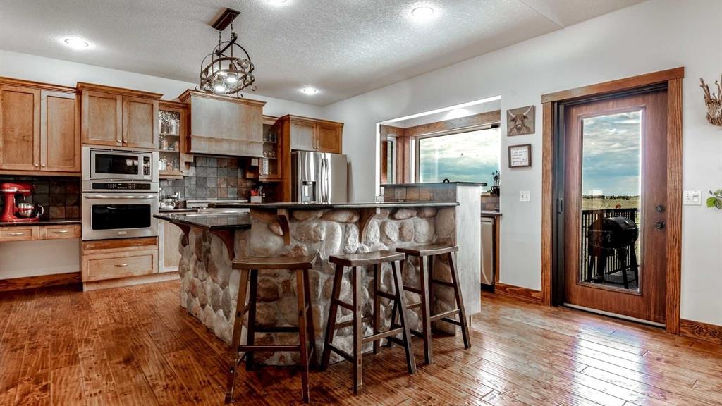 OPPORTUNITY KNOCKS - 3 ACRE PROPERTY WITHIN THE STRATHMORE WEST ASP. Created in 2006 this lovely 3 acre parcel features a FULLY DEVELOPED BUNGALOW offering over 3100 SQ FT of developed living space, an OVERSIZED HEATED TRIPLE GARAGE plus a LARGE SHOP equipped with water and power. Designed with Modern Country sheek details that highlight rustic charm and country living the OPEN FLOOR PLAN is flooded with natural light throughout the day and enjoys A/C on warmer days. A stunning kitchen boasts top of the line appliances and features a massive eat up island with additional seating. The open ended dining area is nestled next to a floor to ceiling rock faced fireplace and overlooks the pristine landscaped rear yard. A FAMILY SIZED GREAT ROOM offers up a restful retreat steps from the kitchen and dining area. The main floor primary bedroom is complete with a 3 pc en-suite bath and walk in closet. Easy access off the triple garage leads into the mudroom, two piece main bath and main floor laundry. HEATED FLOORS and large windows set the stage in the lower level for cozy evenings where you will find a large recreation area plus 3 more bedrooms and a five piece bath. A much desired large storage area completes the lower level. The 4500 sq ft shop with a developed main floor and mezzanine including a 2 pc bath is ready to develop further for long term family. The open area of the shop has an asphalt floor and the walls are insulated and boarded. The two large rear facing doors have the height you need to store your RV. The immaculate grounds feature inground sprinklers and a natural pond that attracts wildlife and birds. The Strathmore West ASP includes this 3 acre parcel. A potential rezoning in a few years might make this 3 acre parcel a worthy commercial consideration? There is a large concrete pad already poured on the North side of the property which would make an ideal base to bring in a modular or mobile home. Permits and applications must go through the Town of Strathmore as this property is annexed in to the Town. Now is the time to think about a long term investment - live here for 10 years while the town builds out towards you and enjoy the potential revenue generation or create a family set up that delivers a dream come true for many. For more information on the Strathmore West ASP please access the uploaded documents.