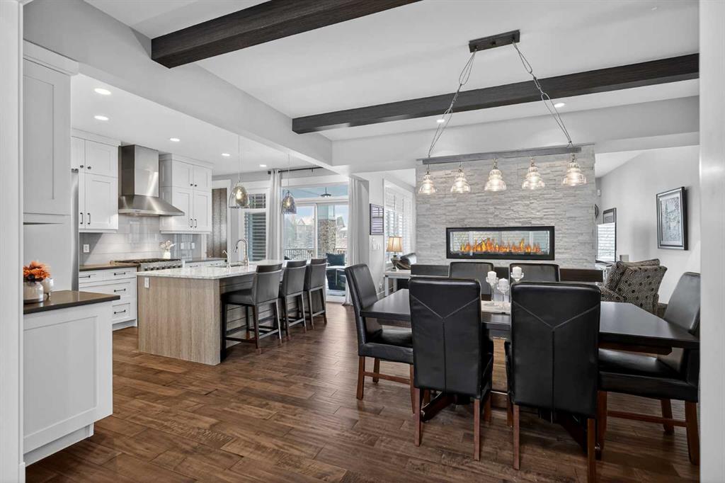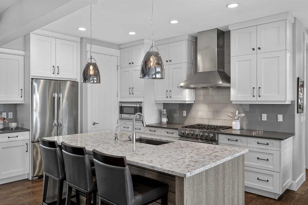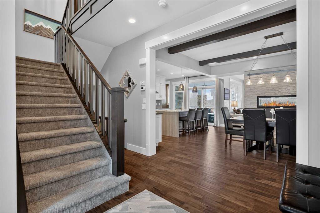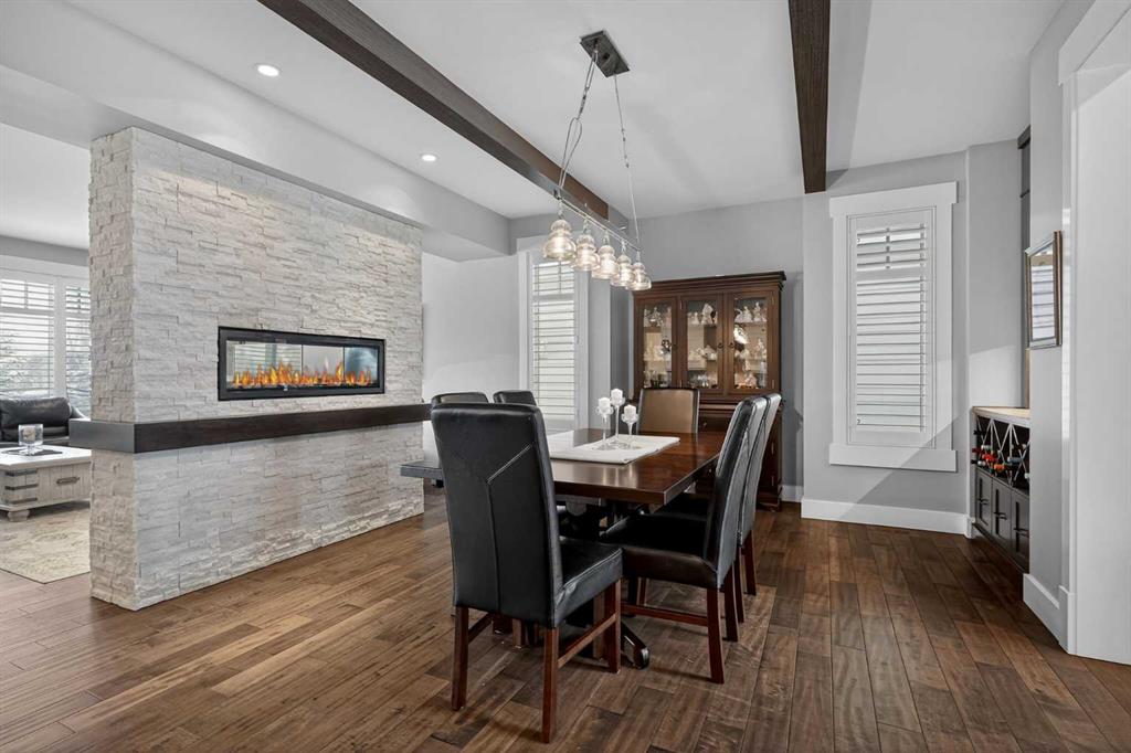 This former Crystal Creek show home is the definition of opulence and luxury. Located directly across the street from Coopers Pond, this 4 bedroom, 3.5 bathroom stunner truly has it all. Curb appeal is evident as you approach the home welcoming you before you even enter. As you come inside, you are immediately greeted with high ceilings and gorgeous wood floors that span the main level. Your eyes will be drawn to the infinite details that are impossible to miss such as the wood beams on the ceiling above your dining room, which is framed with a double-sided fireplace set into a stone wall and accompanied by a classy wine bar. The kitchen is a chef\'s dream equipped with ultra-high-end Viking stainless steel appliances, 2 different types of stone countertops, tons of cabinetry and drawers featuring every upgrade available when the home was constructed. The open floor plan flows from your kitchen into your dining room and through to your large living room overlooking the north facing back yard making this the perfect space for entertaining or for quiet nights at home with the family. A beautiful sliding door allows for ease of access to your large, covered deck, creating the best indoor/outdoor cooking and dining experience. Your half-bathroom with custom wallpaper and a fully equipped laundry room finish off the main level before heading upstairs. With a truly unique design feature exclusive to this home, the home office is a show piece in itself, featuring a gorgeous feature wall framing 3 large south facing windows looking over Coopers Pond and bathing the space in natural light. Your home office has been taken to a level you have never seen before! The bonus room is a great size for family movie nights and offers you a built in desk area for homework or arts and crafts. The primary suite is something you would see in a high end New York hotel and is the perfect space to make your own retreat. The bedroom itself is huge and will easily fit your king-size bed and all of the accompanying bedroom furniture. The spa inspired ensuite is to die for with gorgeous tile floors, an upgraded dual vanity, a massive soaker tub, and a walk-in shower with custom tile work and a seat. Your large walk in closet finishes off the primary suite before heading to the second and third bedrooms which are in a separate wing upstairs. Both are a great size and have direct access to the 4 piece bathroom located between the two bedrooms. The basement is fully finished and is an entertainer\'s dream. You have your own wet bar with a fridge as well as a games area and large living space making it optimal to host friends and family for the big game or just a game night at home. The guest bedroom is a great size and is tucked into a private corner of the basement right beside another full bathroom. This home has dual furnaces, dual air conditioners, in floor heating, a triple tandem garage ,and hot water on demand. The large lot gives you a tranquil back yard backing on to green space.