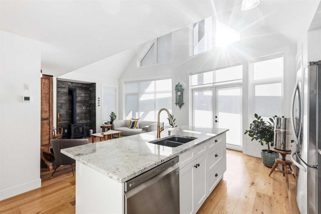Step inside to discover a BRIGHT open and functional floor plan. Floor to ceiling EXPANSIVE windows and CUSTOM BLINDS welcome you with an abundance of NATURAL SUNLIGHT creating a serene environment ideal for relaxation. The attention to detail is evident at every turn, showcasing the meticulous CRAFTSMANSHIP and thoughtful design that define this cottage built by CUSTOM HOME BUILDER Bow View Homes. The living room impresses with stunning 20-foot VAULTED ceilings and a pellet stove to provide warmth and inviting ambiance. Entertain in your BRIGHT, OPEN kitchen with stainless steel appliances, granite countertops, custom soft-close cabinetry, and access to the front COVERED PORCH. There is no lack of storage in this thoughtfully laid out kitchen perfect for all your entertaining needs. The main floor also includes a large back Foyer with BUILT IN storage, and a bedroom with a 3-piece bathroom across the hall.