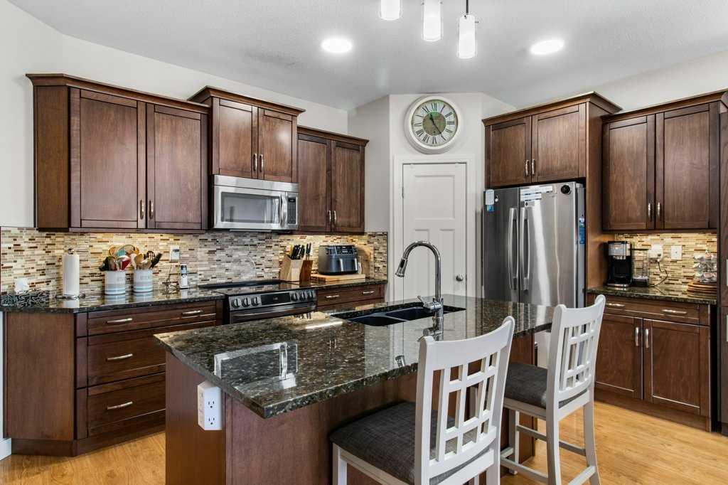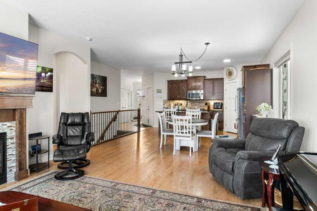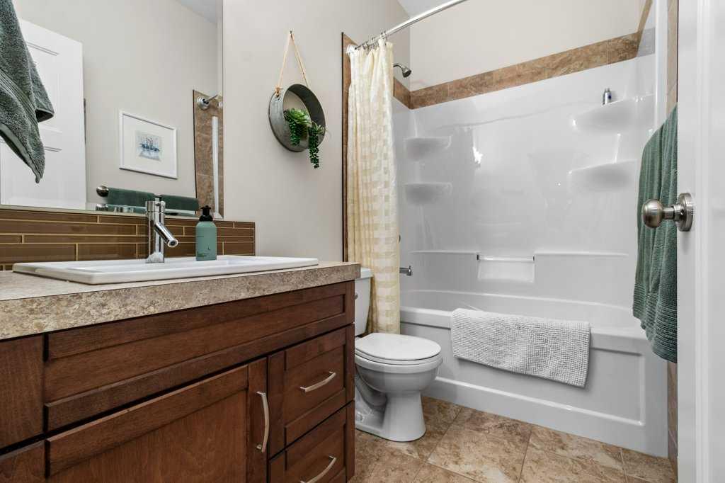 Located in the desirable town of Lacombe, this well-built half duplex bungalow by Colbray Homes offers a walkout basement and backs onto green space with direct access to scenic walking trails. The landscaped yard and peaceful setting make it easy to enjoy the outdoors right from your backyard. Inside, the main floor features high-end laminate and ceramic tile throughout, along with a bright, open layout and 9’ ceilings that create a spacious feel. The kitchen is thoughtfully designed with dark maple soft-close cabinetry, granite countertops, a Blanco under-mount sink with garburator, stove with gas hook up if desired, coffee bar, and a large island with overhang—perfect for entertaining. A walk-in pantry adds extra storage, while the separate main floor laundry room includes cupboards, counters, and a sink for added convenience. The living room is warm and inviting with a gas fireplace and mantle, plus a garden door leading to the deck where you can take in the views, complete with phantom screens. The main floor offers a spacious primary bedroom that easily accommodates a king-sized bed and includes a walk-in closet, along with an additional bedroom and a den, providing flexibility for guests or a home office. The 5-piece ensuite offers a relaxing retreat with a soaker tub, separate shower, double sinks, and a private water closet. Downstairs, the fully developed walkout basement features in-floor heat, a bright family room with access to the concrete patio and backyard, two additional bedrooms, a dedicated media room, a 4-piece bathroom, and plenty of storage in the mechanical room. Additional highlights include a high-efficiency furnace, high-efficiency hot water tank, R60 insulation, Greenbuilt certification, and a double attached garage that is insulated, drywalled, and roughed-in for gas heat. Professionally painted in neutral tones and showing like new, this home combines quality craftsmanship with modern comfort in a beautiful setting.
