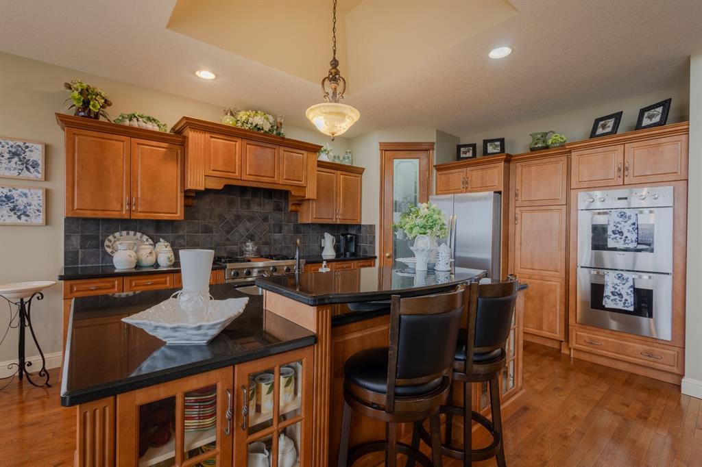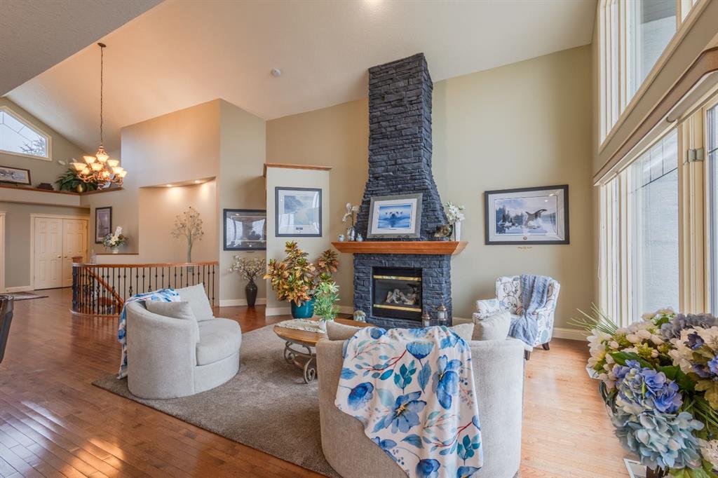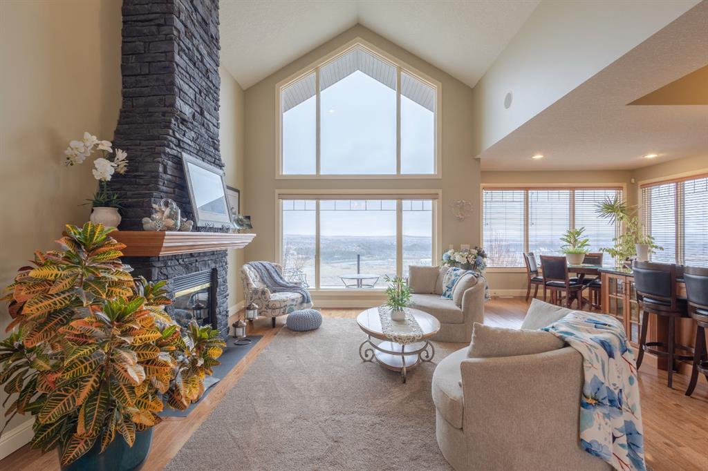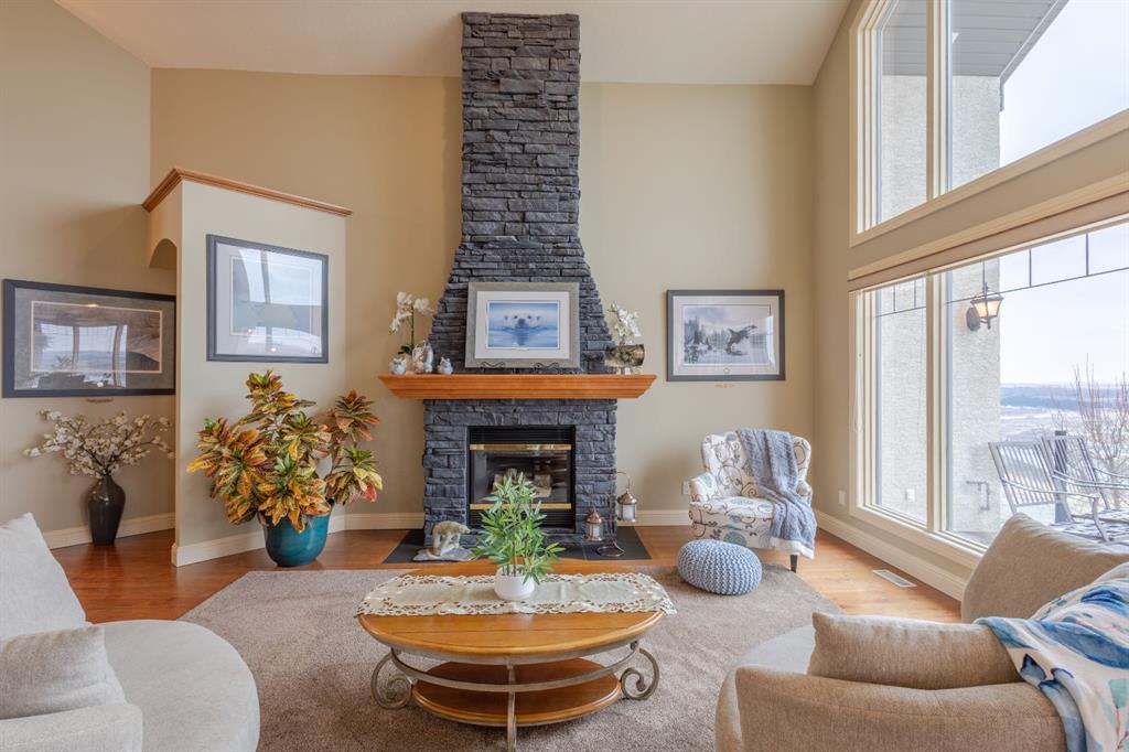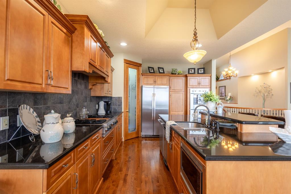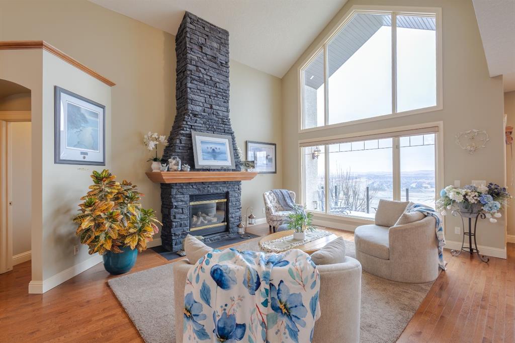 Incredible location - quiet cul-de-sac backing onto the golf course and boasting incredible panoramic views of the valley, river and mountains! Step into a home that offers a truly grand sense of arrival, where beautiful hardwood flooring flows seamlessly throughout and soaring vaulted ceilings create an immediate impression of space and elegance. Just off the front entrance, a gorgeous front office provides the perfect setting for working from home, while a large front dining room offers an inviting space for hosting memorable dinners and gatherings. The heart of the home is the stunning kitchen, thoughtfully designed for both everyday living and entertaining. It features a large island with raised breakfast bar seating, gleaming granite countertops, and stainless steel appliances, including a premium Viking gas range stove and oven. A convenient corner pantry adds to the functionality, while the open layout connects effortlessly to the bright eating nook. Here, you’ll enjoy panoramic views of the valley, with direct access to the back deck—perfect for morning coffee or evening relaxation. The living room is equally impressive, showcasing a gas fireplace with a beautiful stone surround and wooden mantle. Expansive windows frame incredible views of the river valley and beyond, filling the space with natural light and enhancing the home’s airy feel under vaulted ceilings. Retreat to the spacious primary suite, where comfort meets luxury. This serene space continues to capture breathtaking views and features a striking triple-sided fireplace. The 5-piece ensuite includes a stand-alone shower, dual vanity, and a large soaking tub, complemented by a generous walk-in closet. The lower level offers additional living space to suit a variety of needs, including a well-appointed laundry area with a sink. The basement boasts a large recreation room with a gas fireplace featuring a tile surround and mantle, as well as direct access to a lower-level patio. Two spacious bedrooms—one with a walk-in closet—along with a 3-piece bathroom provide excellent accommodations for family or guests. A massive storage room ensures plenty of space for organization. Outside, the backyard is truly exceptional, backing onto a walking path and golf course with stunning views of the river and valley. A fenced yard includes direct access to the pathway system, perfect for outdoor enthusiasts. Additional highlights include an oversized heated garage with ample shelving, as well as air conditioning for year-round comfort. Nestled in the heart of Gleneagles, this home perfectly blends luxury, functionality, and breathtaking natural surroundings.