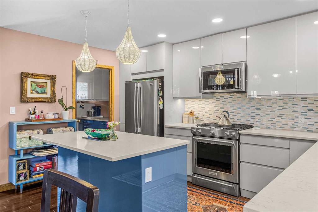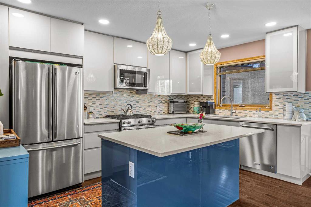 Offering 5 bedrooms and 4 bathrooms, this thoughtfully designed home delivers exceptional space and versatility, ideal for families, multi-generational living, or investment potential. The main living space features an elegant open-concept layout, highlighted by an updated kitchen with stainless steel appliances, a large island for gathering, and ample storage throughout. An adjoining laundry room with matching cabinetry adds even more functionality. Just off the kitchen, a cozy living area offers a flexible space for relaxing or working from home, while the formal living and dining area is filled with natural light, capturing beautiful mountain views and anchored by a wood-burning fireplace. From here, step out onto the spacious deck—perfect for morning coffee, summer barbecues, and taking in the views of Cascade Mountain.