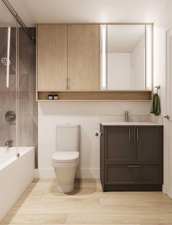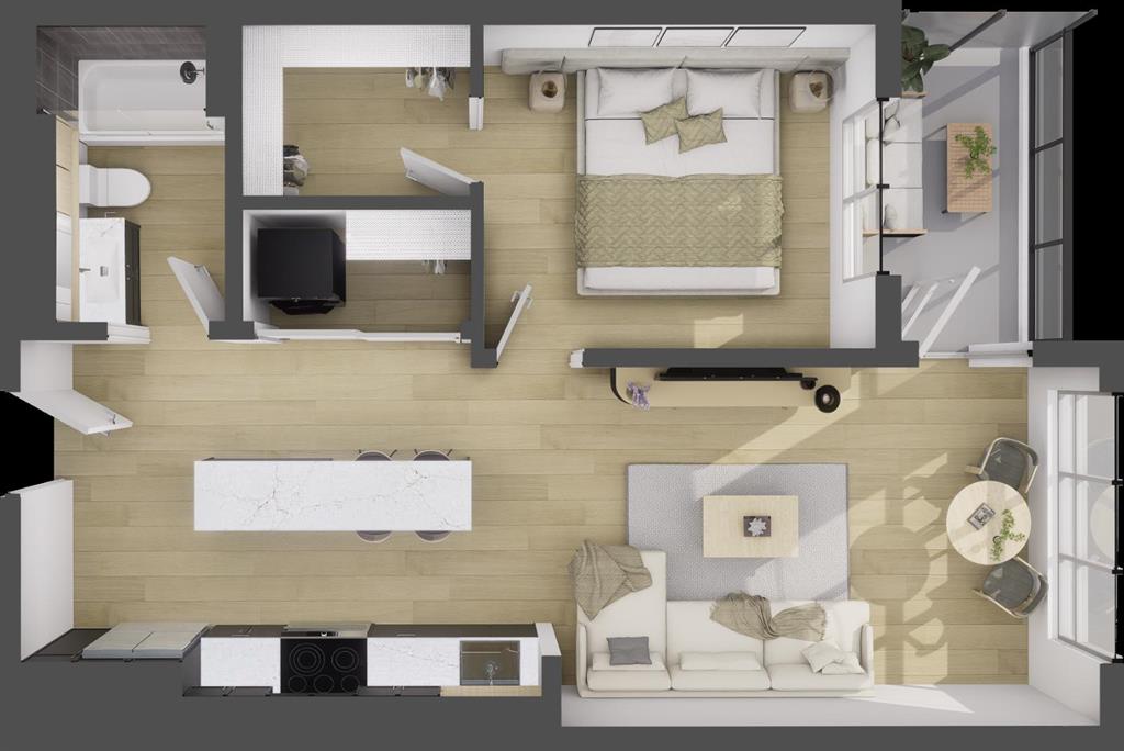 The sleek kitchen showcases quartz countertops, full-height cabinetry, under-mount sinks, and a central island with pendant lighting. Energy-efficient stainless-steel appliances and smart-controlled stacked laundry provide both convenience and modern efficiency. Retreat to the well-appointed bedroom complete with a generous walk-in closet, while the elegant bathroom features clean modern detailing, quartz surfaces, and timeless fixtures. Durable luxury vinyl plank flooring flows throughout, complemented by curated interior palettes and contemporary ceiling finishes. Enjoy outdoor relaxation on your private balcony. Built with quality construction standards including triple-pane windows, engineered floor systems, and enhanced soundproofing, this home offers comfort, quiet, and energy efficiency.
