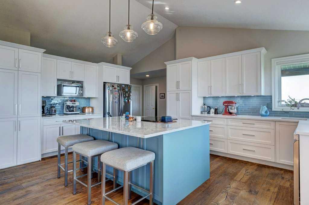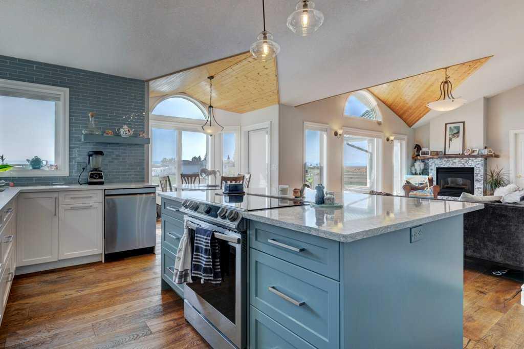 The kitchen offers both style and function with stainless steel appliances, quartz countertops, a bold blue tile backsplash, garburator, stylish pendant lighting, and a large island with breakfast bar seating. The smart layout and ample cabinetry make it ideal for everyday living and entertaining. From here, step onto one of two expansive decks; one covered and equipped with a gas hookup for year-round BBQing. The second deck also connects to the private primary bedroom, offering peaceful views across the prairies.
