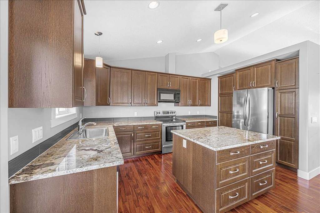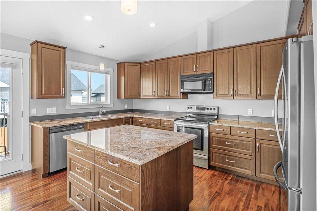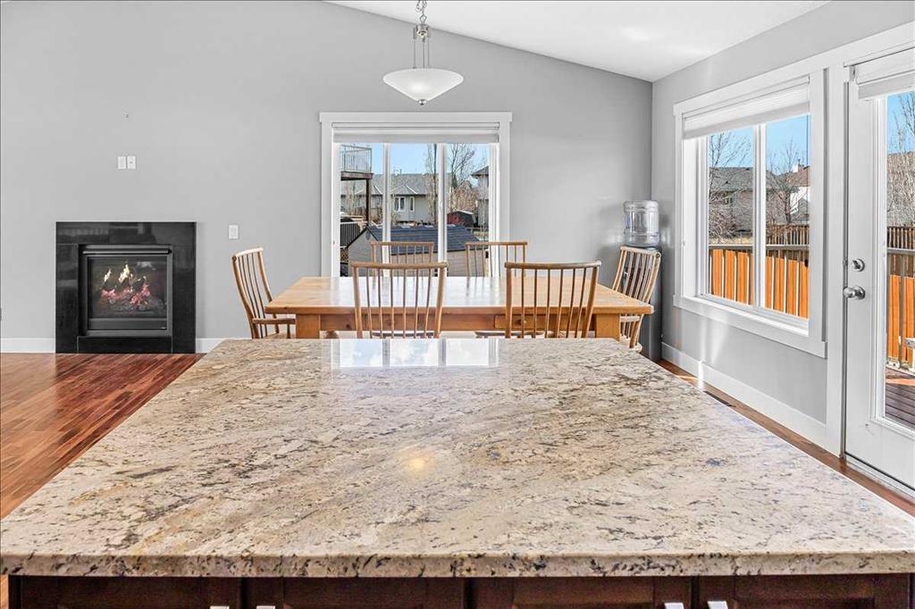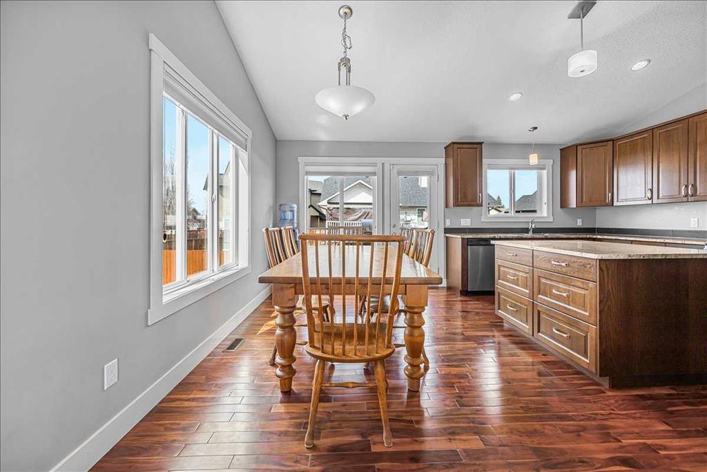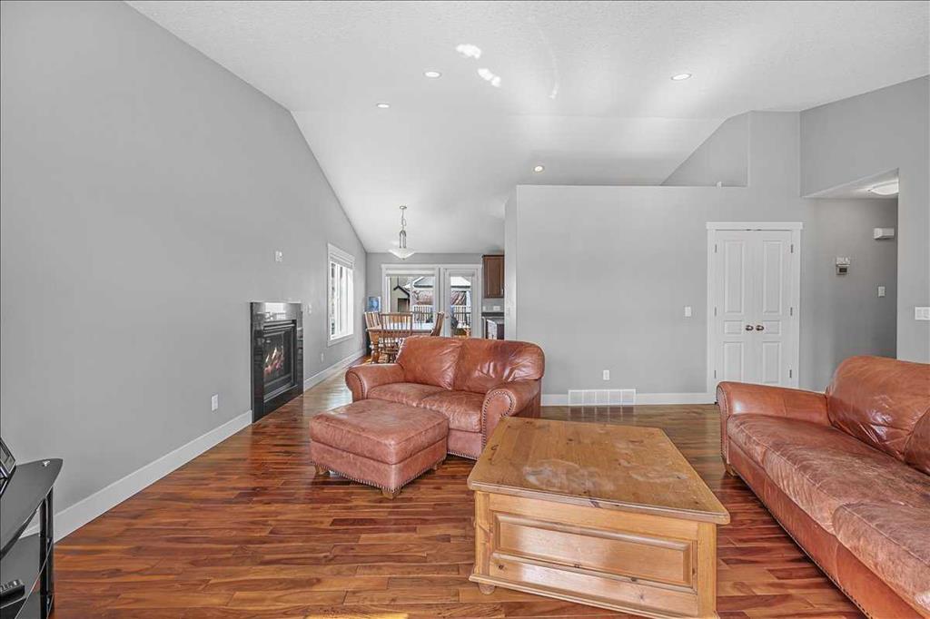 Welcome to this spacious, 1274 sq.ft bungalow located in the desirable community of Cambridge Glen in Strathmore. Offering 4 bedrooms ( 2 up & 2 down) and 3 baths, this home is designed for comfortable and functional living. The main floor features a bright living room with bay window, hardwood flooring and a cozy fireplace that creates a warm connection between the living, dining & kitchen areas. Well designed kitchen with island, plenty of cupboard & counterspace, perfect for both everyday living & entertaining. The primary bedroom is generously sized and includes a 4pc ensuite with soaker tub. You\'ll also appreciate the convenience of main floor laundry. The fully developed lower level offers 2 additional bedrooms, 3 pc bath and a spacious rec/games room, offering plenty of space for family living & relaxing. Step outside and enjoy the pie-shape lot, offering a wider backyard-ideal for maximizing outdoor space and usability. You\'ll appreciate the heated 20x21 attached garage with shelving & storage space. Additional highlights include in-floor heating, central air conditioning, underground sprinklers and storage under the front step. Recent upgrades include four-class-four shingles, eavestroughs, downspouts and 8 ft garage door. Ideally situated close to schools, park, recreational facilities and walking paths. This home offers both comfort and convenience in a sought after neighborhood in Strathmore. Enjoy small town living with all amenities close at hand, plus a short commute to Calgary & YYC International Airport.