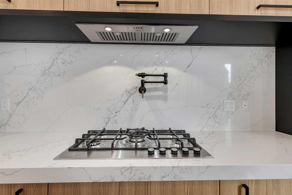 The heart of this home is the exquisite kitchen, featuring a striking waterfall island, a through sink, and top-of-the-line Fisher & Paykel built-in panel-covered fridge and freezer. Cooking enthusiasts will appreciate the natural gas stove with pot filler, convection oven, and speed oven/microwave, all complemented by stylish three-tone custom cabinetry illuminated by under-cabinet lighting.