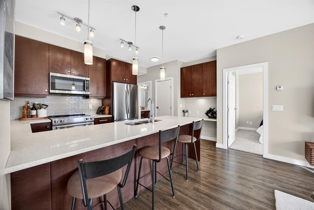 This bright and beautifully maintained 2-bedroom, 2-bathroom condo offers an incredible combination of space, comfort, and walkability in one of Calgary’s most vibrant inner-city communities. As one of the larger units in the building, this home is filled with natural light and features TWO balconies—both west-facing perfect for enjoying the afternoon sun and evening light. Thoughtfully designed for everyday living, the unit showcases an open concept floor plan, ample storage, stainless steel appliances, soft close cabinetry, wide-plank flooring, in-floor heating, and a functional layout that feels both spacious and inviting.