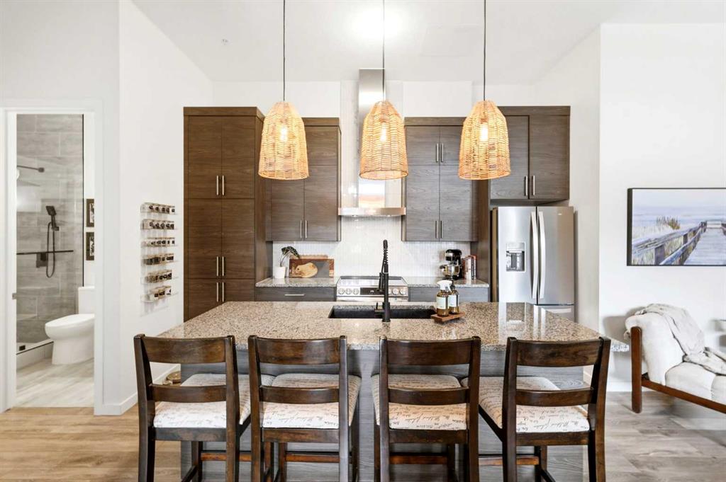 **Open House April 19th 2:00PM-5:00PM** Units like this don’t come up often. This is one of the rare ground floor layouts in Westman Village with its own private entrance, soaring 12 foot ceilings, and oversized windows that flood the space with natural light and make it feel far more like a townhome than a typical condo. The layout is clean and functional with a modern kitchen featuring a large island, sleek cabinetry, and stainless steel appliances that opens directly into the living and dining space, all of it oriented toward the courtyard. The patio is fully covered for year round use and looks into the interior courtyard where you get the sound of the water features and a quiet, private extension of your living space. The bedroom is generous with a walk in closet, there is full size in suite laundry, air conditioning, and titled underground heated parking with additional storage. From a pure livability standpoint, this unit just works. Then you layer in what Westman Village actually is. Full concierge, secure access, and an amenity package that is in a different category than almost anything else in the city. Indoor pool, hot tub, saunas, full fitness center, gymnasium, golf simulator, theatre room, wine vault, workshop, art studio, walking track, library, plus restaurants, café, and everyday essentials right inside the village. You are also just steps to Mahogany Lake with access to pathways, beaches, and everything the community offers. This is one of the few buildings where the condo fees actually make sense because you use what you’re paying for. Whether it’s a young professional, a couple, downsizer, or someone with a pet looking for that private entry setup, this is a rare opportunity to step into a lifestyle that’s hard to replicate anywhere else in Calgary.