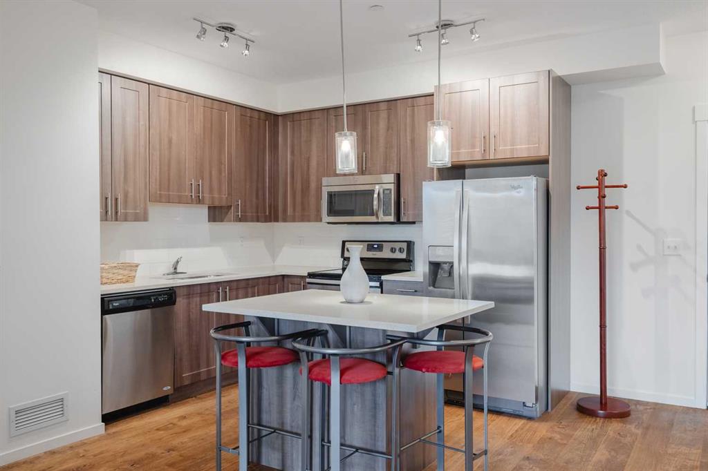 Spacious 2-bedroom, 2-bathroom condo with windows in both bedrooms — a rare find. This large unit offers 825 sq.ft. (builder size) of open-concept living space, complete with hardwood flooring throughout the main areas, upgraded stainless steel appliances, quartz countertops, and full-height kitchen cabinets for added storage and style.