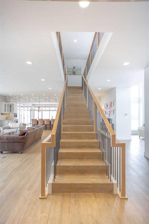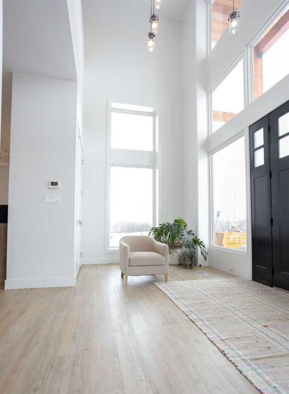 Inside, the open-concept main floor features soaring floor-to-ceiling windows that flood the home with natural light and capture expansive prairie views. A wood-burning fireplace with custom rock surround anchors the living space. The chef’s kitchen is designed for both entertaining and everyday use, complete with quartz countertops, premium appliances, custom cabinetry by Redl Kitchens, and two large islands. Step outside to the concrete wrap-around covered porch with matching cedar post and beam detail.