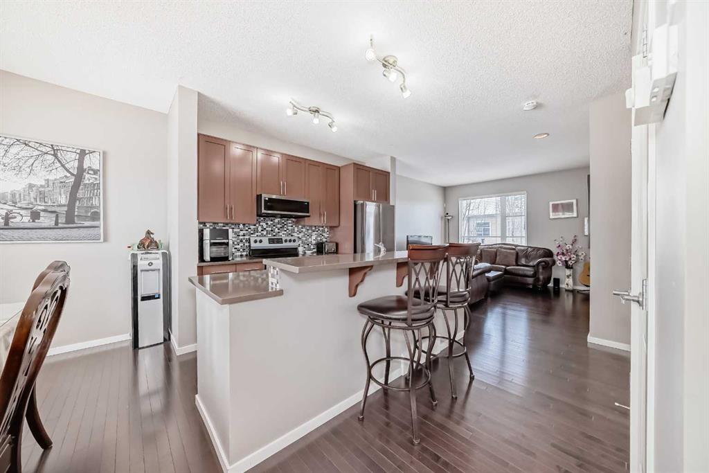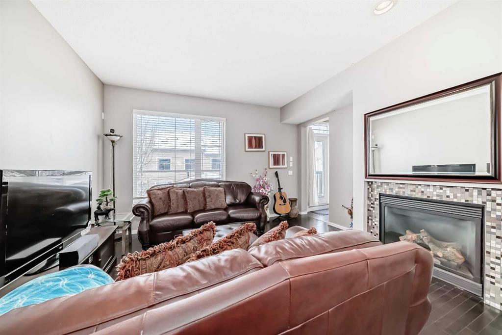 WELCOME TO THIS REALLY NICE TOWNHOUSE IN THE COVETED AREA OF CHAPARRAL. TWO PRIMARY BEDROOMS WITH ENSUITES, DBL GARGE ( RARE) FRONT PATIO AND BALCONY, FINISHED PARTIAL BASEMENT, AND MANY UPGRADES. This beautiful townhome features an open-concept, sleek design and finishes, with a modern look. Walking in, you will appreciate the hardwood flooring and big windows that let natural light stream in, along with newer blinds. The kitchen has SS appliances featuring a large double-door refrigerator with water, Quartz counters and a large Island that seats 4. The living room has a cozy gas fireplace for you to warm up to on those cold winter evenings. There\'s a mudroom-type area that leads to a door onto the balcony. Completing this floor is a 2-piece bathroom. Upstairs, YOU\'LL NOTICE THE NEWER CARPET (2023), and the rare 2 bdrms, both with en-suites and walk-in closets. The laundry room is also on the upper floor for convenience. This is ideal for extended families or roommates. Downstairs is a partially finished basement with a flex space and roughed-in for a bathroom. What sets this property apart from the others is the double garage, as most in this complex only have a single garage. Also, you will love the front patio with a gas BBQ hookup. Low condo fees, $412 a month. Theres plenty of storage and off-street parking, close proximity to shopping, restaurants, schools, public transportation and of course the all season lake which offers all types of outdoor activities, and recreation facilities. Don\'t miss this chance to own a fabulous new home.