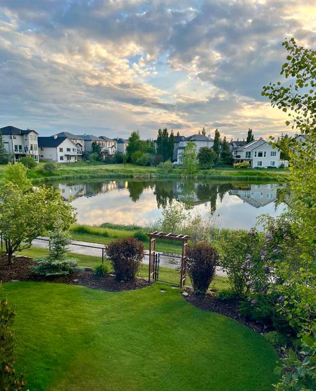 Set on a quiet cul-de-sac and backing onto the walking path surrounding an 8-acre pond, this beautifully appointed two-storey home offers an exceptional setting with peaceful views and a thoughtful layout designed for everyday functionality. The main floor welcomes you with 9\' ceilings, rich hardwood flooring, and a bright open-concept design. At the heart of the home, the kitchen is both stylish and functional, featuring warm cinnamon stained maple cabinetry, granite countertops, black and black stainless steel appliances, a walk-through pantry, and a large island with breakfast bar seating. From there, the space flows effortlessly into the dining area, surrounded by windows and perfectly positioned to take in the views, before opening into the inviting living room where a cozy fireplace adds warmth and a cozy ambiance. Step out from the dining space onto the expansive upper deck, an ideal place to relax, entertain, or simply enjoy the tranquil backdrop. A private office, 2-piece powder room, and laundry room complete the main floor. Upstairs, a spacious family room provides the perfect place to unwind, while a full bathroom and three well-sized bedrooms offer excellent space for family or guests. The primary suite is a true retreat, complete with a large walk-in closet and a beautifully appointed 5-piece ensuite featuring double sinks, a deep soaker tub, and a separate shower. The professionally developed walkout basement extends the home’s living space with an expansive rec room, with space for a home theatre area, wet bar, fourth bedroom, full stylish bath with multi-head shower and in-floor heating, and plenty of storage. From here, step directly outside to the lower deck and beautifully landscaped lush west facing backyard beyond where mature trees, a tiered garden, and a shed create a private and inviting outdoor setting, all backing onto the pathway that winds around the pond. Additional highlights include gemstone lighting at the front and back of the home, a smart underground sprinkler system with Wi-Fi and Bluetooth capability, a fully paid-for solar panel system, and an oversized double attached garage. Surrounded by pathways, ponds, nearby schools, parks, and everyday shopping and services, this is a home that offers both a peaceful setting and exceptional convenience within one of Chestermere’s most established family communities.