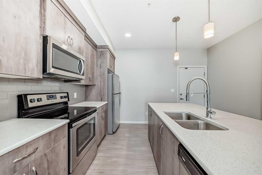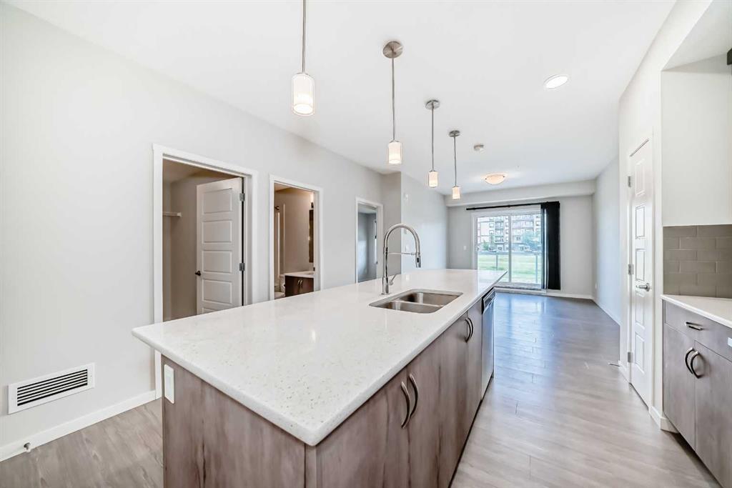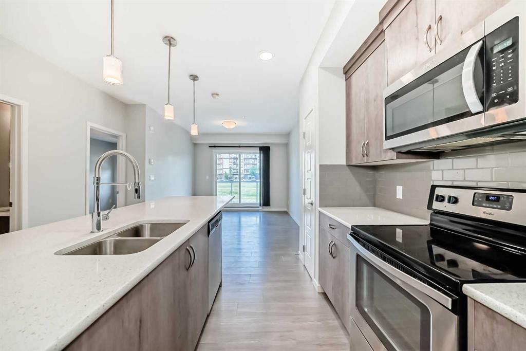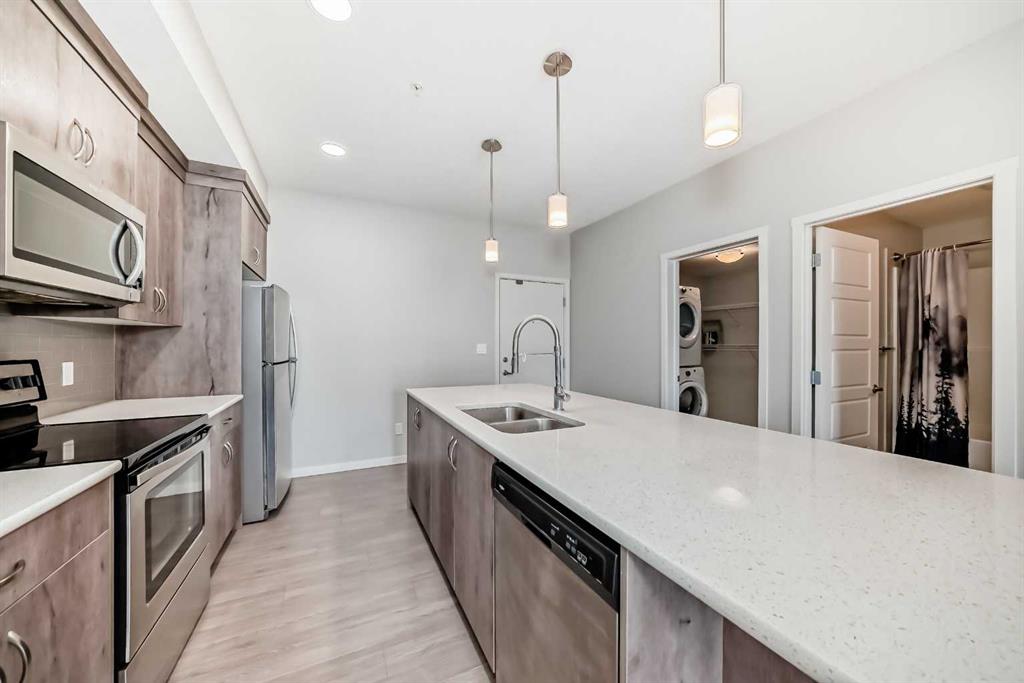This sleek 2 bedroom, 2 bath condo is waiting for you. This unit\'s open floor plan is spacious and bright with 9 ft ceilings throughout. The kitchen features a large quartz island with plenty of seating space and cupboards. There is a large laundry/storage room which is plenty big enough to store your bikes and possibly camping equipment for your great weekend get aways. There is a spacious deck for relaxing after a busy day or having friends by for a bbq. From the deck there is a great view of the South Campus Hospital which is only a few minute walk. Also is this great community is the new YMCA which is just across the street from this awesome property. Also featuring in the neighbourhood is a high school, library, movie theatres, plenty of restaurants, shopping, parks and playgrounds. This building is pet friendly with approval of course. There is titled underground parking plus underground and outside visitor parking. Don\'t delay call your favourite Realtor today for your private showing.