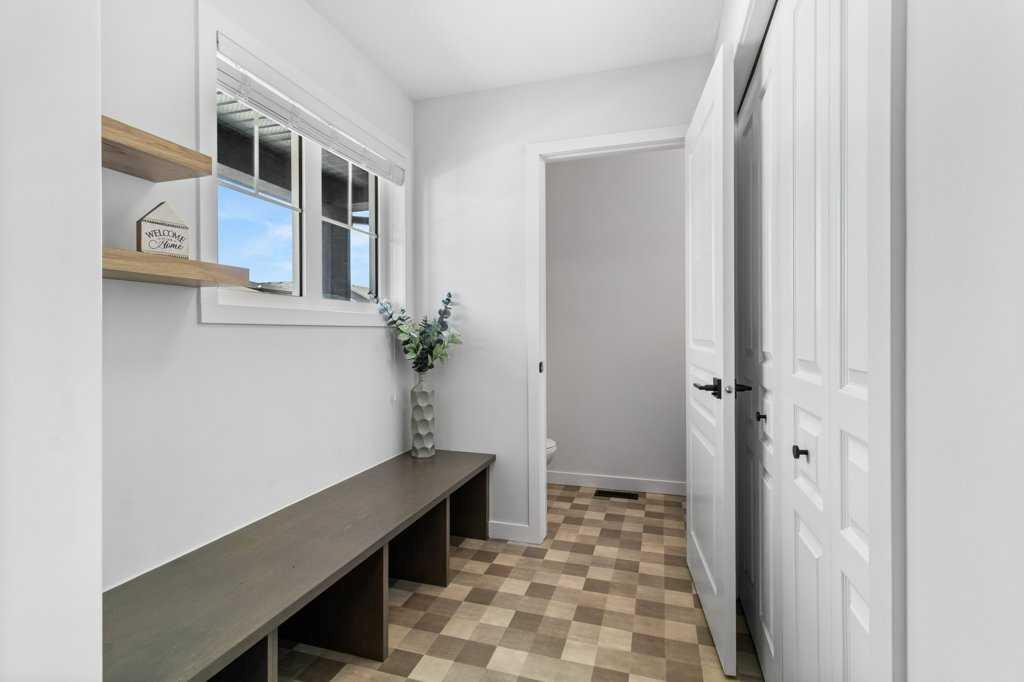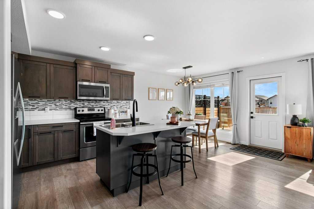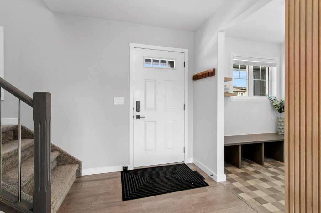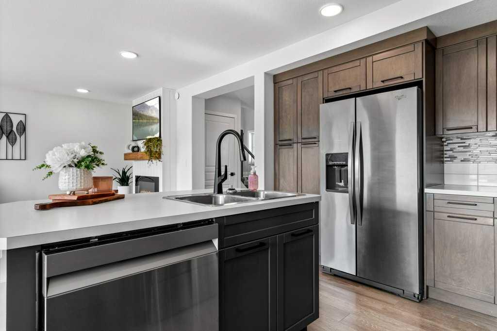 Welcome to this beautifully developed, two-storey home located in a desirable community just minutes from the lake, parks, schools, and with quick access to the highway—perfect for both families and commuters. Thoughtfully designed with 4 bedrooms and 4 bathrooms, this home offers a functional and inviting layout throughout. The main floor features a bright and spacious living room featuring a built in electric fireplace that flows into the kitchen and dining area, creating a space for entertaining and everyday living. Two large windows flood the space with natural light, highlighting the rustic barn wood–style laminate flooring. The kitchen has dark cabinetry with modern black hardware, updated lighting, faucets, and finishes for a fresh, contemporary feel. A convenient two-piece bathroom and a mudroom with a built-in bench and closet complete the main level. Upstairs, you’ll find three generously sized bedrooms, including a comfortable primary suite with a walk-in closet and a private four-piece ensuite. A full four-piece family bathroom and the added convenience of upper-floor laundry make this level especially practical for busy households. The fully developed basement extends your living space with a family room, a fourth bedroom, and an additional four-piece bathroom. New baseboards and trim throughout the home add an updated touch. Outside, enjoy the charm of a covered front veranda, perfect for relaxing mornings or evening visits. The south-facing backyard is fully fenced and features an extended deck with a privacy wall, a fire pit area, and plenty of space to unwind or entertain. A gravel parking pad at the rear offers convenient off-street parking with future garage potential. This move-in ready home combines comfort, style, and location—an excellent opportunity in a sought-after neighborhood.
