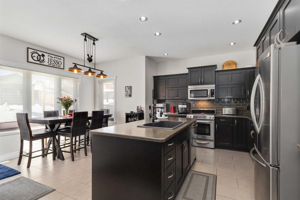 The spacious main floor includes an open concept flow ready for entertaining and family! The welcoming living room complete with a cozy gas fireplace showcases gorgeous custom built in shelving and entertainment unit. The flow from living, kitchen and dining room is the perfect package for the growing family! ( Access to the backyard off the dining room is also perfect to enjoy the sunny days with the kiddos or late night soaks in the hot tub) The kitchen is complete with warm espresso cabinetry, boasting loads of storage, countertop prep space, stainless steel appliances and eat-up kitchen island. The double granite black sink offsets this space along with updated light fixtures! There are banks of windows throughout offering an abundance of natural light too!