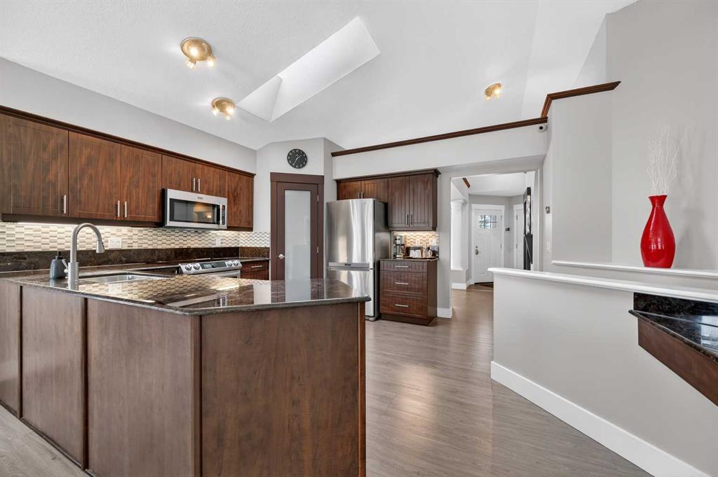 *** OPEN HOUSE SUNDAY 12-2PM *** What a SPECTACULAR property and AMAZING opportunity here! Very rare 1500 sqft bungalow with 3 bedrooms up plus a den/office. Newer vinyl floors though the main with upgraded appliances, elegant kitchen with gorgeous granite counters and rich cabinetry. Large living area is warmed by the elegant 3-sided fireplace adjacent to the dinning area that offers access to the large vinyl deck where you’ll enjoy the west facing exposure with gorgeous sunsets. Primary suite hosts a generous walk-in closet and 4 piece ensuite, the 2 other rooms are both quite big and share another full bath. The lower walk-out level offers 2 more spacious bedrooms, an additional office or flex space and another large living space / recreational space. Windows are 15 years new, Roof in 2008, Furnace in 2022, Water tank is 5 years young, fully wired for sound with an incredible customized & hard wired alarm system. Large garage, insulated, drywalled, painted and fully customized with cabinetry & shelving. Outside is an exposed aggregate walkway from the front to the back with a lower-level patio underneath the deck. Fully zero scaped for no maintenance, beautiful rock arrangements, raised flower beds and a soothing corner water feature. Out front we have a quaint front porch to enjoy the sunrise, a new garage door, zero scape continues with rock gardens and beautiful flower beds. No detail is spared in this incredibly well-maintained home; the pride of ownership is extremely evident with its unique customization and thoughtful finishing. Book a tour today and make it yours!