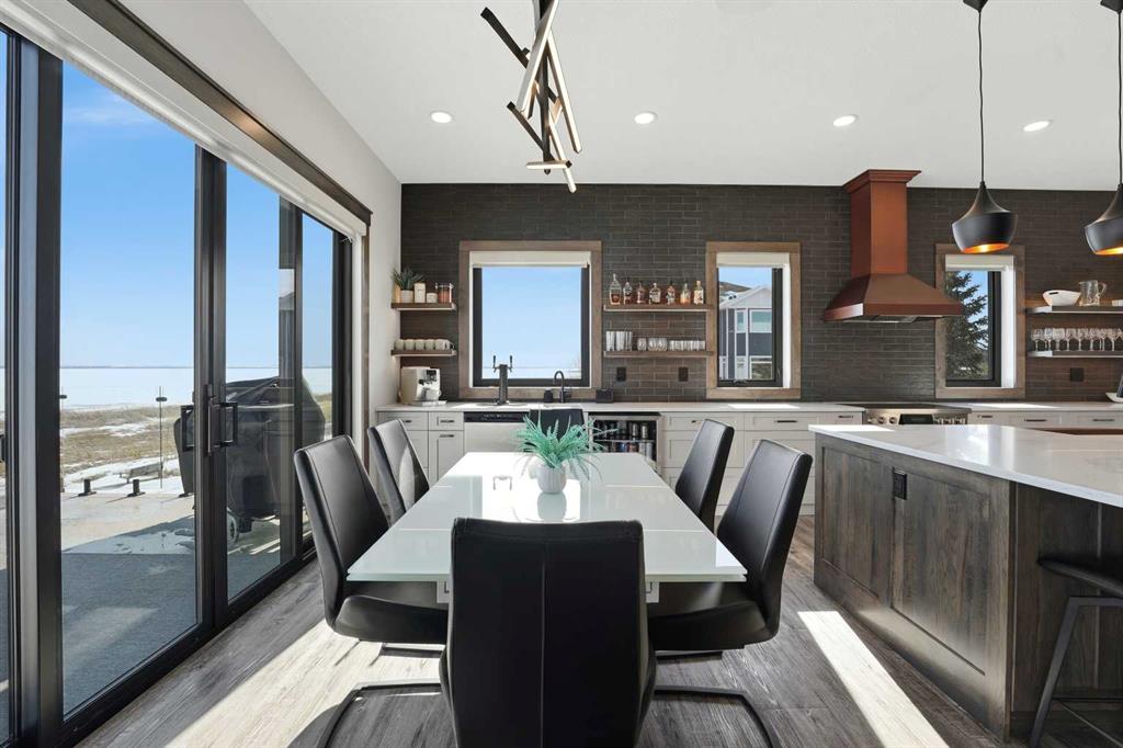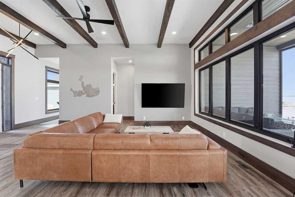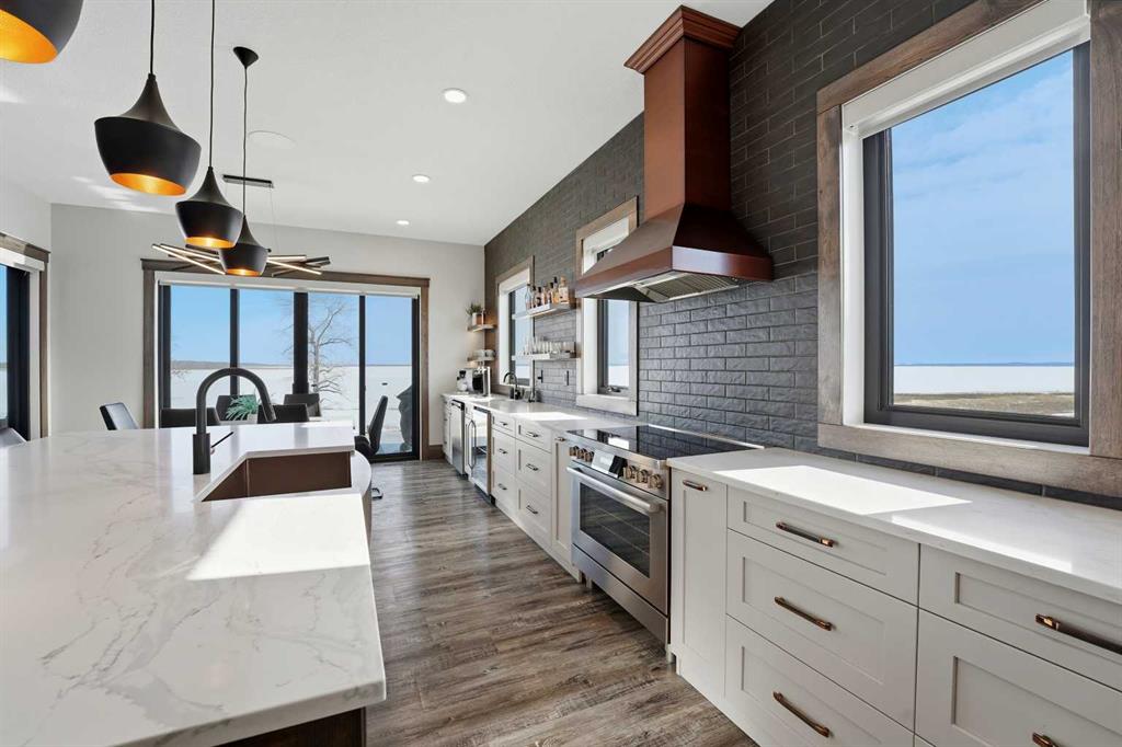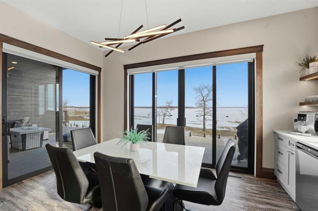 Be prepared to be impressed by this luxury lakefront home in Pelican View Estates offering nearly 3,400 sq ft of finished living space! From the moment you arrive, the curb appeal stands out with composite siding, stone accents, and an oversized stamped concrete driveway, along with additional paved parking beside the garage ideal for an RV or guests. Inside, the main living area features 10’ ceilings, luxury vinyl plank flooring, upgraded thick hickory trim, and expansive lake views through the large triple-pane windows. The kitchen is a true showpiece with white cabinetry, expansive quartz countertops, and an upgraded stainless steel appliance package including a 36” induction cooktop, side-by-side fridge/freezer, beverage fridge, and a kegerator that can also be used for carbonated drinks, while the oversized island adds even more space with a huge quartz counter and stylish hickory cabinetry. The dining area is surrounded by windows with lake views, and the living room showcases a striking 12’ ceiling with fir finished beams. Just off the entrance is a mudroom with hickory lockers and garage access. The primary bedroom offers lake views through the sliding doors to the deck, and a feature shiplap wall with an electric fireplace, along with an ensuite featuring dual sinks, a custom tiled steam shower, and access to a spacious walk-in closet. A 2-piece bathroom completes the main level. The walkout basement opens to a large family and games area with a wood stove and access to the outside stamped concrete patio. There is also two bedrooms, an office with included Murphy bed (or can be a third bedroom if desired), a 4-piece bathroom, laundry room, a cold storage room, and a dedicated home theatre with an included projector and screen. The theatre room also features a vault-style metal door, allowing the area to double as secure storage or a safe room, plus an additional 4-piece bathroom and storage room. The attached garage is heated, finished with Trusscore panels which are waterproof, includes hot and cold water taps, 8’ overhead doors, and measures over 36’ wide by 28’ deep. The outdoor living is exceptional with a full-width deck accessible from the dining area and primary bedroom, finished with Duradek, frameless glass railing, a covered section with a built-in heater and a powered screen to enclose it, while below the deck is a stamped concrete walkout patio extending to a fire pit area and a low-maintenance artificial turf yard. Both the upper covered deck and lower patio feature tongue-and-groove pine ceilings. The home also includes permanent perimeter lighting. Another standout feature is the $80,000 Control4 system offering remote control of lighting, blinds, security cameras, HVAC and more. Pelican View Estates provides community trails, a shared dock with the option to own a boat slip (negotiable on this sale, with slips valued around $7,500), and raking of the beach making it one of the nicest beaches in central Alberta just steps from your back door!