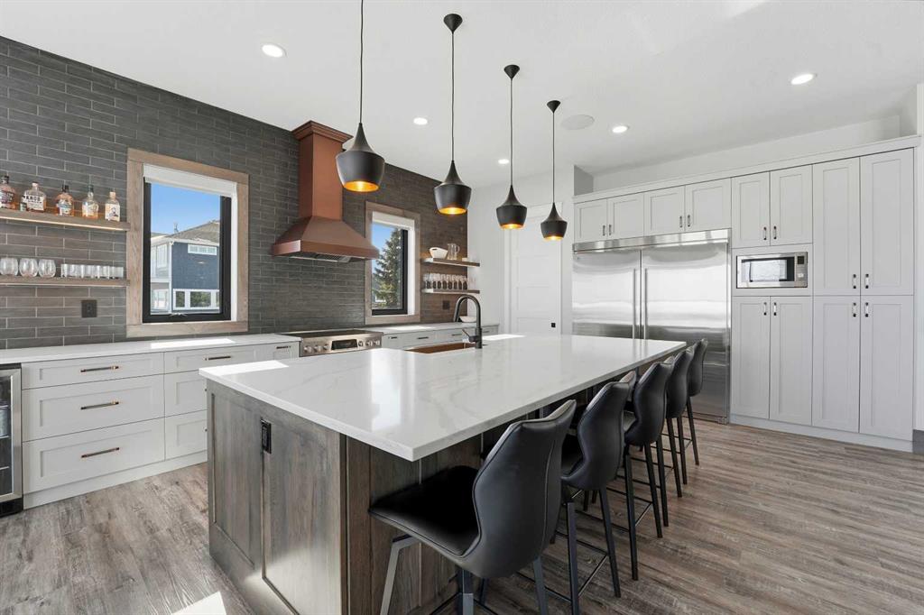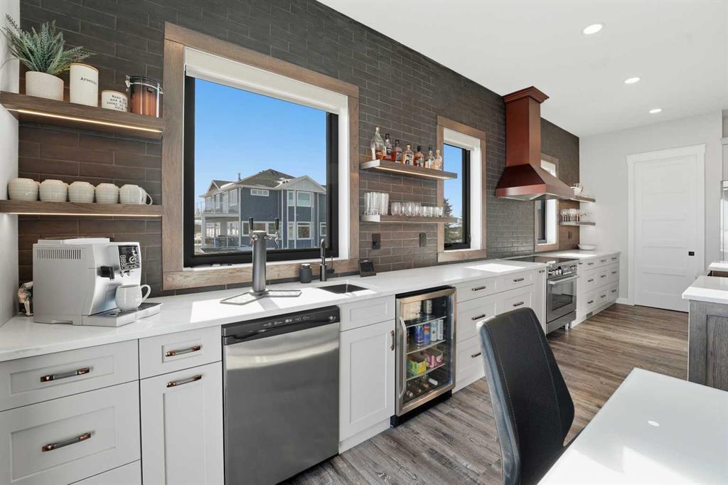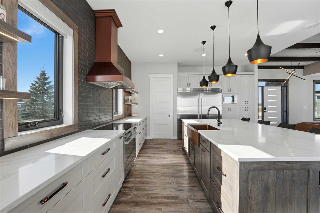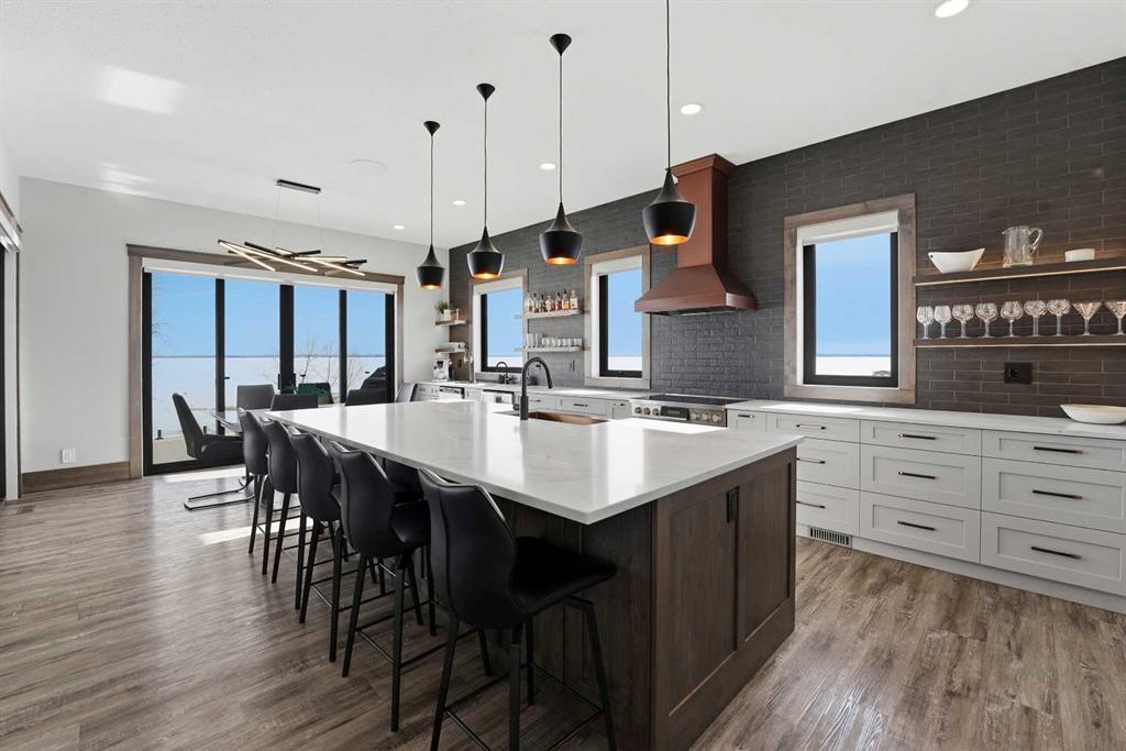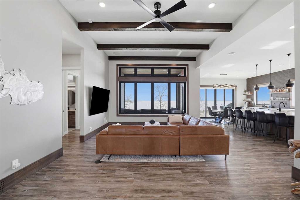 Be prepared to be impressed by this luxury lakefront home in Pelican View Estates offering nearly 3,400 sq ft of finished living space! From the moment you arrive, the curb appeal stands out with composite siding, stone accents, and an oversized stamped concrete driveway, along with additional paved parking beside the garage ideal for an RV or guests. Inside, the main living area features 10’ ceilings, luxury vinyl plank flooring, upgraded thick hickory trim, and expansive lake views through the large triple-pane windows. The kitchen is a true showpiece with white cabinetry, expansive quartz countertops, and an upgraded stainless steel appliance package including a 36” induction cooktop, side-by-side fridge/freezer, beverage fridge, and a kegerator that can also be used for carbonated drinks, while the oversized island adds even more space with a huge quartz counter and stylish hickory cabinetry. The dining area is surrounded by windows with lake views, and the living room showcases a striking 12’ ceiling with fir finished beams. Just off the entrance is a mudroom with hickory lockers and garage access. The primary bedroom offers lake views through the sliding doors to the deck, and a feature shiplap wall with an electric fireplace, along with an ensuite featuring dual sinks, a custom tiled steam shower, and access to a spacious walk-in closet. A 2-piece bathroom completes the main level. The walkout basement opens to a large family and games area with a wood stove and access to the outside stamped concrete patio. There is also two bedrooms, an office with included Murphy bed (or can be a third bedroom if desired), a 4-piece bathroom, laundry room, a cold storage room, and a dedicated home theatre with an included projector and screen. The theatre room also features a vault-style metal door, allowing the area to double as secure storage or a safe room, plus an additional 4-piece bathroom and storage room. The attached garage is heated, finished with Trusscore panels which are waterproof, includes hot and cold water taps, 8’ overhead doors, and measures over 36’ wide by 28’ deep. The outdoor living is exceptional with a full-width deck accessible from the dining area and primary bedroom, finished with Duradek, frameless glass railing, a covered section with a built-in heater and a powered screen to enclose it, while below the deck is a stamped concrete walkout patio extending to a fire pit area and a low-maintenance artificial turf yard. Both the upper covered deck and lower patio feature tongue-and-groove pine ceilings. The home also includes permanent perimeter lighting. Another standout feature is the $80,000 Control4 system offering remote control of lighting, blinds, security cameras, HVAC and more. Pelican View Estates provides community trails, a shared dock with the option to own a boat slip (negotiable on this sale, with slips valued around $7,500), and raking of the beach making it one of the nicest beaches in central Alberta just steps from your back door!