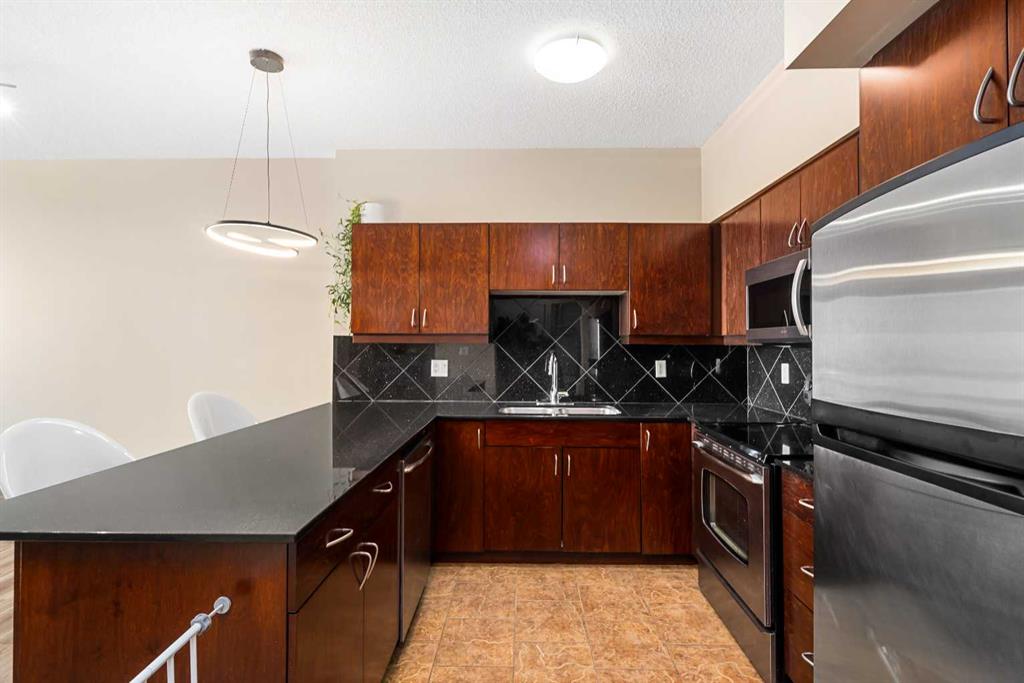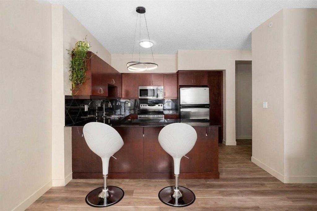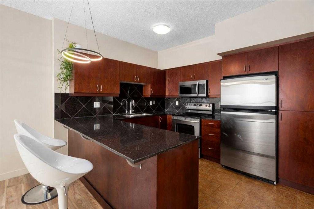 Welcome to this 1-bedroom, 1-bath condo with true pride of ownership and modern updates. Boasting 9-foot ceilings, an open-concept layout, and south-facing windows, this home is bright, airy, and move-in ready. Brand-new LVP flooring, freshly painted neutral walls, Newer Boiler, and stainless steel appliances enhance style and functionality throughout. The kitchen features ample cabinetry, granite counters, and a large island perfect for meal prep or casual dining. A breakfast bar connects seamlessly to the dining and living areas, creating an ideal space for entertaining. Step out onto the private balcony with a gas line for easy barbecuing and enjoy sunny southern views. The primary bedroom offers a spacious closet, while a versatile 4-piece bathroom includes granite counters and dedicated storage. In-suite laundry adds convenience, and the unit comes with one unassigned heated underground parking stall.