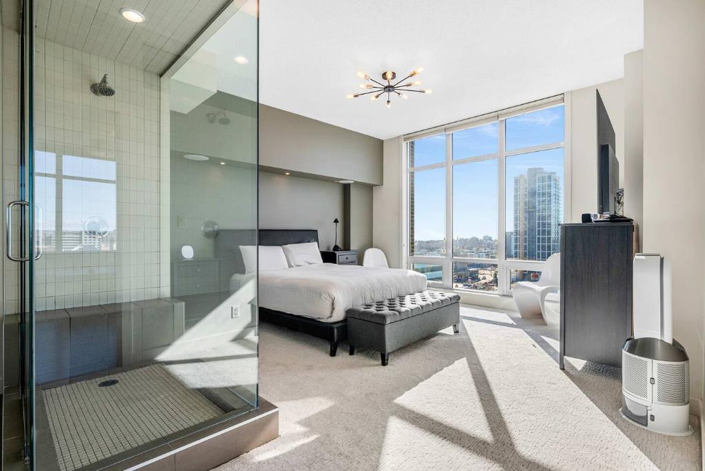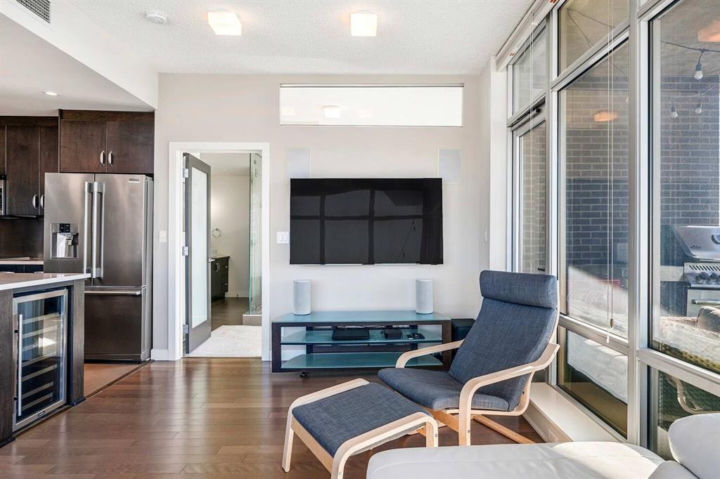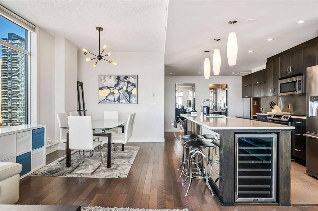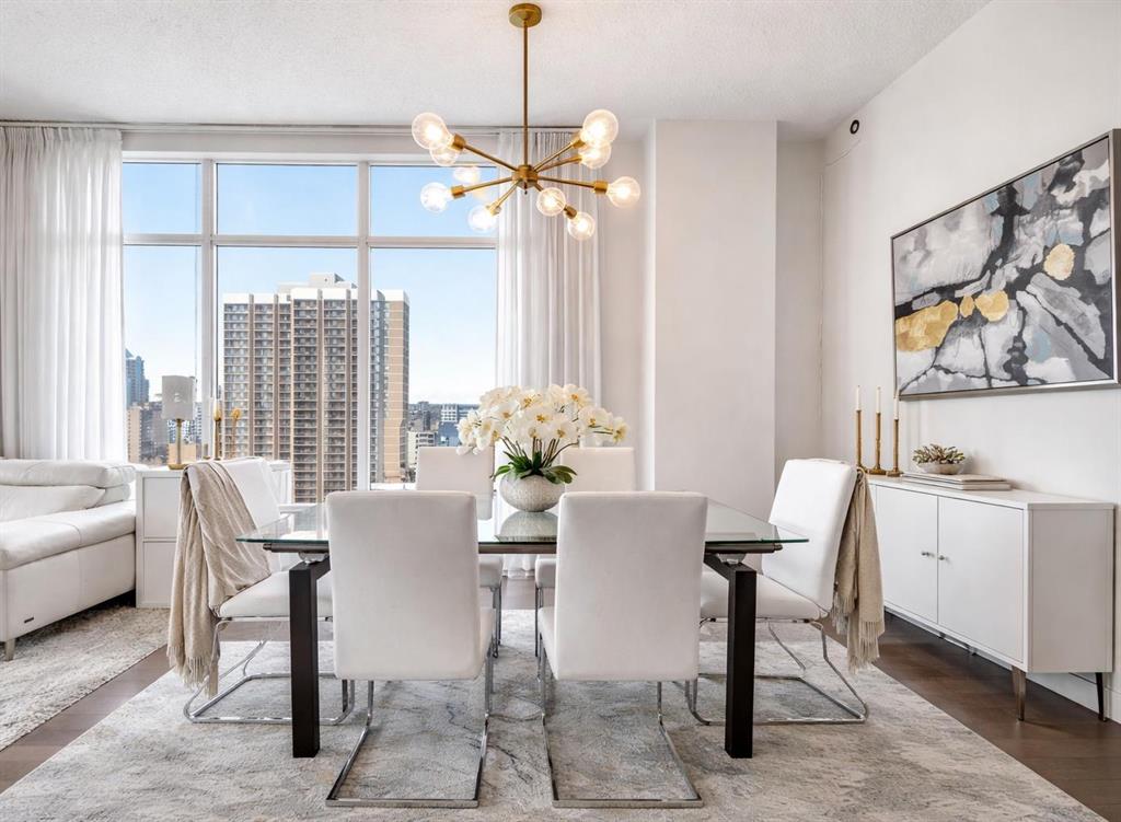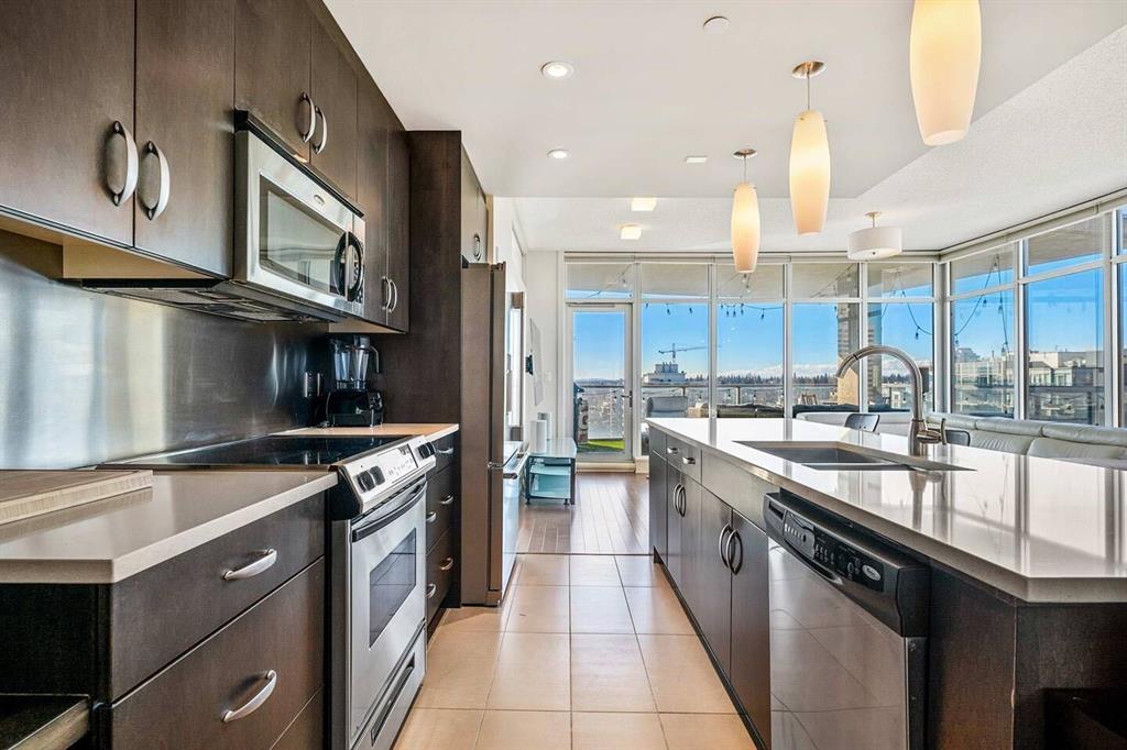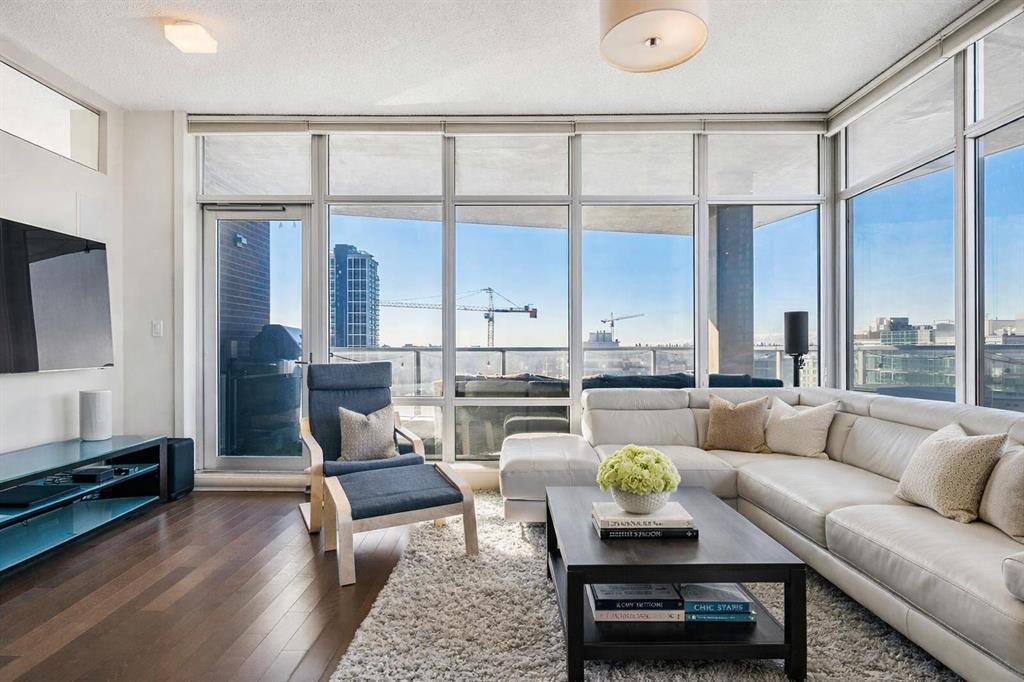 Welcome to this beautifully upgraded 13th-floor southwest corner residence in the Castello, offering ~1,200 sq. ft. of thoughtfully designed living space in one of Calgary’s most prestigious Beltline addresses. The corner position delivers natural light from multiple exposures, with sweeping mountain views to the west and inner-city views to the south. Only five units per floor in this quiet, concrete building – privacy and sound insulation are built in. The open-concept layout puts every square foot to work – no wasted hallway space. The kitchen features stainless steel appliances, granite countertops, soft-close cabinetry, a built-in wine bar, and updated lighting. Floor-to-ceiling windows and 9-foot ceilings with hardwood floors open directly onto the unit’s standout feature: a massive covered and Astroturfed wraparound patio of nearly 300 sq. ft. with natural gas hookup. Southwest-facing with prolonged sunshine, panoramic mountain and Beltline views, including direct sightline to the Stampede fireworks. The primary bedroom features a large walk-in closet with built-in organizers and a spa-inspired ensuite with 10 mm glass shower and dual vanity. The second bedroom includes a built-in desk and Murphy bed – home office by day, guest room by night. The main bath features upscale tile, fixtures, and hardware. Highlights: central A/C, in-suite laundry, Hunter Douglas honeycomb blinds, two titled heated parking stalls, and titled storage locker. Amenities: concierge, fitness centre, guest suite ($75/night), car wash bay, visitor parking, bike storage. Professionally managed and maintained. Pets are welcome. Steps from 17th Avenue, Stephen Avenue, restaurants, grocery, transit, and the downtown core. This is executive urban living – designed for professionals who want space, mountain views, and an unbeatable location.