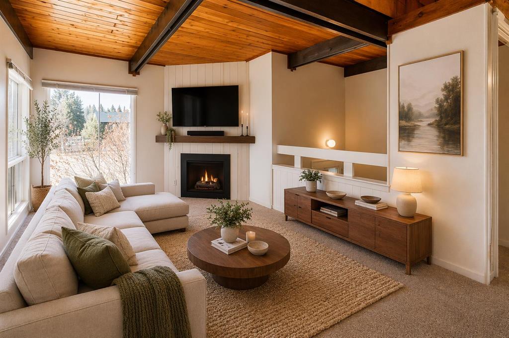 Welcome to this well maintained, bilevel style duplex. NO CONDO FEES!!.....It is ideally situated on a quiet street and set on a generous sized lot - Perfect for those seeking space and privacy. The main floor features a bright and inviting living room/dining room combination, complimented by a functional galley style kitchen and full bath. Warm cedar ceilings and a cozy fireplace add character and charm, creating a comfortable space to relax and entertain. Downstairs, the lower level offers two good sized bedrooms along with a furnace/laundry room, providing practical living and efficient use of space. Recent upgrades include newer windows and roof. Conveniently located close to shopping, public transit, and an off leash area. This property offers both lifestyle and accessibility. The current tenant is vacating May 31st, making this an excellent opportunity for homeowners or investors alike...
