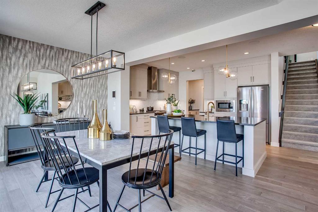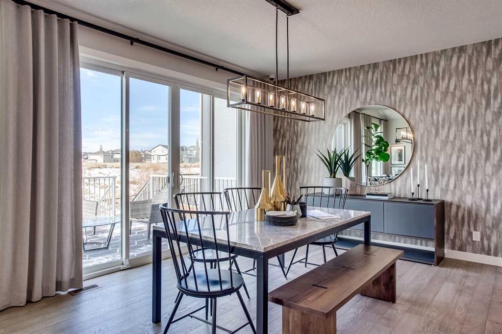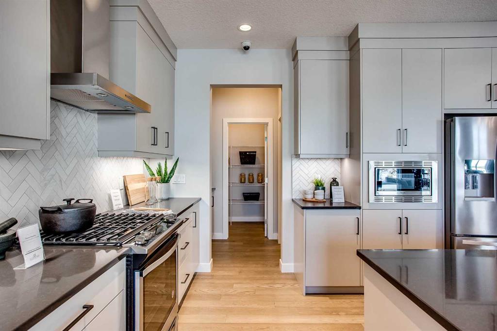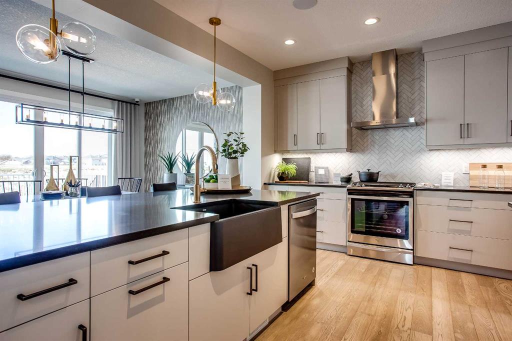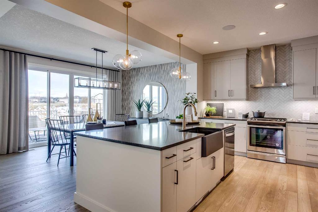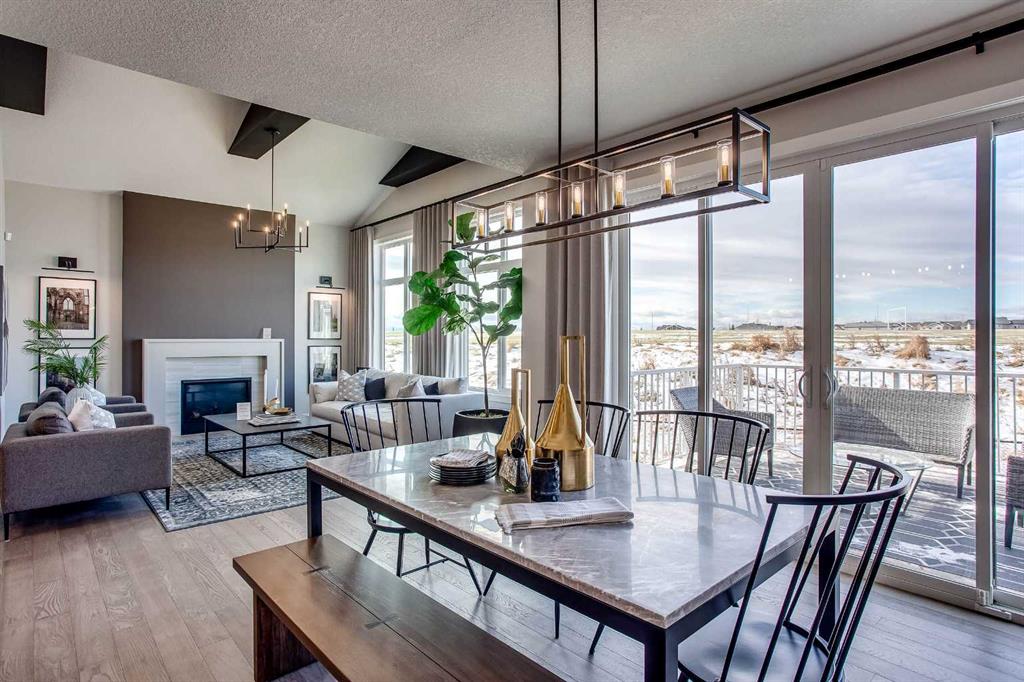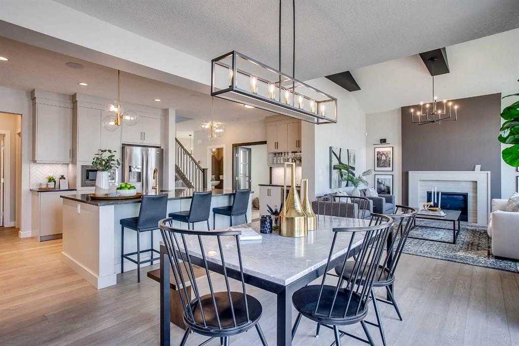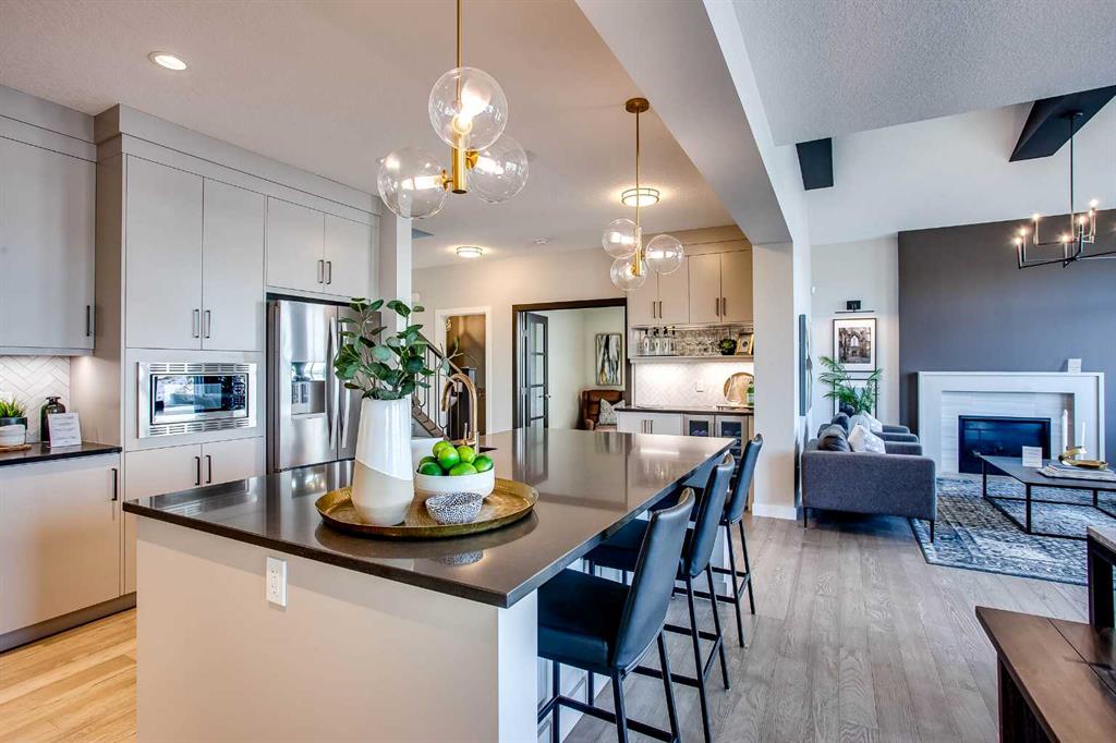 Exquisite Former Show Home with Majestic Mountain Views. Welcome to the \"Hennessy III\" by Calbridge Homes, an award-winning former show home where sophisticated designer upgrades meet an unparalleled lifestyle location. Backing onto a serene green space with a coveted west-facing backyard, this residence offers a front row seat to breathtaking Rocky Mountain sunsets. The interior is bathed in natural light, highlighted by wide-plank hardwood floors and custom designer lighting throughout an open-concept layout masterfully planned for both intimate family life and grand-scale entertaining. The gourmet chef\'s kitchen serves as the heart of the home, featuring full-height cabinetry, a massive breakfast bar island, premium stainless steel appliances with a gas range, and a substantial butler\'s pantry for seamless organization. In the grand great room, soaring vaulted ceilings with wood beams and a tiled fireplace create a sense of scale, while a signature wall of windows perfectly frames the outdoor oasis. For those seeking a quiet workspace, elegant French doors lead to a dedicated den perfect for a sophisticated home office. The upper level is a true sanctuary of comfort, led by a primary retreat featuring a massive walk-in closet and a spa-inspired ensuite with dual vanities, an oversized shower, and a deep soaker tub. A versatile central bonus room offers the ideal loft space for movie nights, complemented by three additional bright bedrooms, a full family bathroom, and a conveniently located laundry room. The professionally finished basement significantly extends the living space, offering a massive recreation area and a fully equipped wet bar with a beverage fridge. A large fifth bedroom and full bathroom provide a private space for guests or older children. Complete with a generous triple-car garage, this home is close to the incredible walking paths that lead you throughout the parks and playgrounds this community has to offer. Enjoy unbeatable convenience being just minutes from the C-Train, YMCA, community center, and a vibrant array of local shops and dining. Experience the pinnacle of craftsmanship and scenery in this rare property. Call today for your personal viewing.