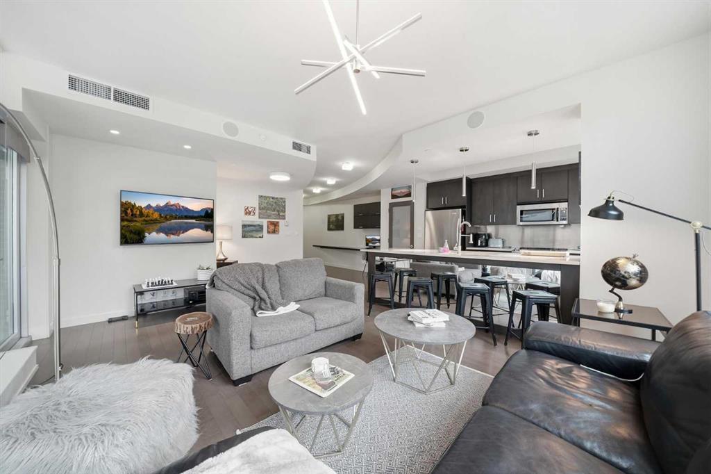 The sleek, contemporary kitchen features quartz countertops, modern cabinetry, a striking metal backsplash, and newer oven and bar fridge—perfect for both everyday living and entertaining. The sun-filled living area showcases hardwood flooring, new light fixtures throughout, and built-in ceiling speakers, creating the perfect atmosphere for relaxing or hosting guests.