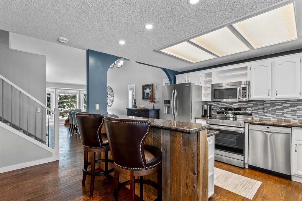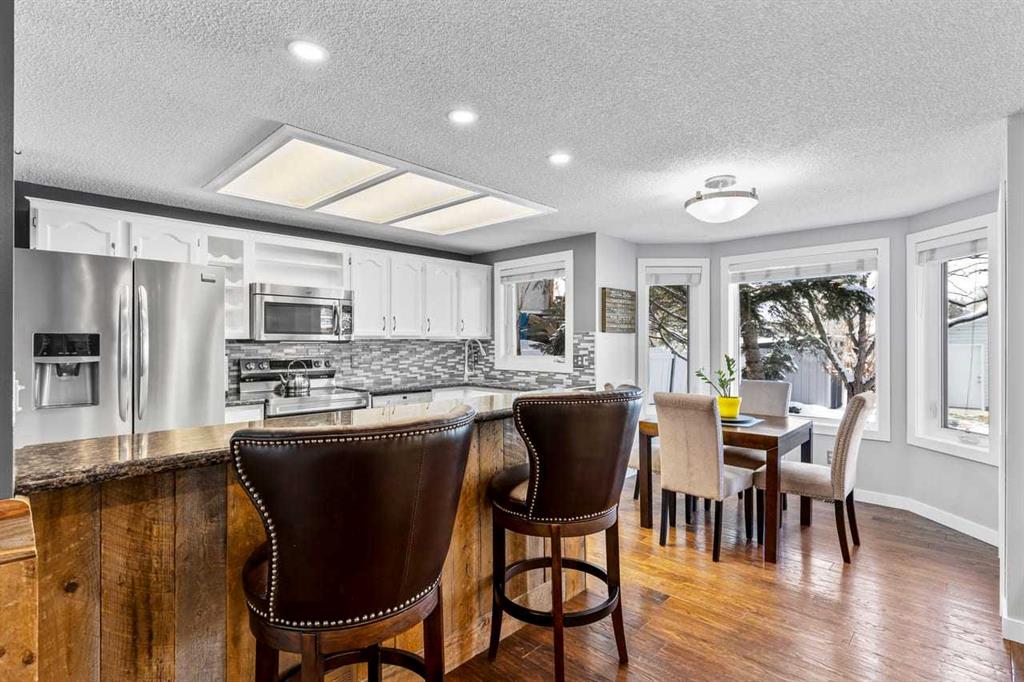 ** Open Houses APRIL 3 from 2-3:30 pm, April 5 12-1:30 pm, April 12 from 2 pm - 4pm ** Welcome to this beautifully updated two-storey home nestled in a quiet, mature northwest neighbourhood, where towering trees, larger lots, and a true sense of community meet modern comfort—and where the rare dual-garage setup with full vehicle access to both sets this property apart in the most exciting way. Whether you envision the ultimate man cave, private office, workshop, or she-shed retreat, this home offers unmatched flexibility for how you live, work, and unwind. Inside, you’re greeted by soaring vaulted ceilings, a warm and inviting layout with formal living and dining spaces, and a stunning family room anchored by a stone surround fireplace with wood mantle and custom built-ins, bringing that perfect touch of rustic charm. The kitchen has been beautifully refreshed with brand new stainless steel appliances, freshly painted cabinetry, and granite countertops, blending timeless style with modern upgrades. Hardwood floors span the main level, leading to a functional mudroom with laundry and a recently updated two-piece bath. Upstairs offers three bedrooms, including a newly updated ensuite, while the fully developed basement provides a massive rec space, additional family room, and future potential. Step outside to an incredible-SECLUDED backyard oasis with a large cedar deck and pergola, mature landscaping, and room to breathe—something only established communities can offer. With a heated double detached garage, additional shed and woodshed, and that standout second garage access, plus major updates like triple pane windows, new doors, trim, lighting, roof, and more, this home perfectly balances rustic warmth with fresh, modern living. All of this, just moments from major routes and with easy access west to the mountains—making it the ideal blend of nature, convenience, and versatility