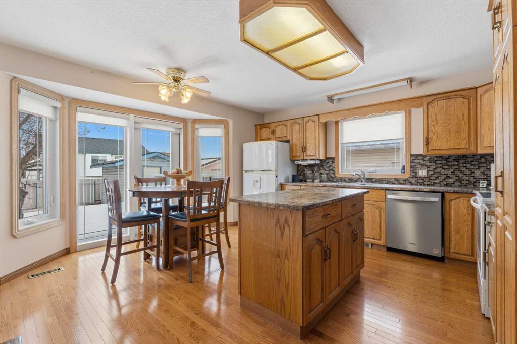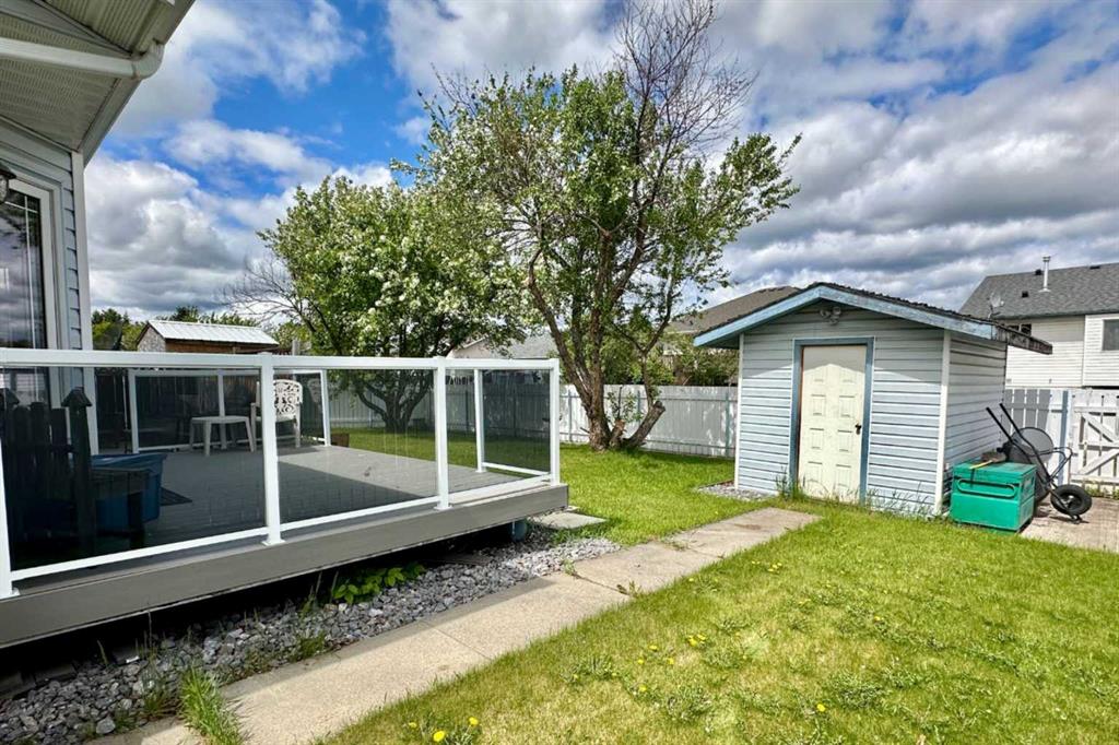A well-kept 3-level split home with ample storage space. 19\'x20\' attached and heated front garage, perfect for keeping your vehicles safe and warm during the colder months. The garage also features great storage shelves and a convenient sink. Upon entering the main entrance, you\'ll be greeted by high ceilings that create a sense of openness and a sunken living room. The main floor showcases beautiful hardwood flooring throughout, giving the space a warm and inviting feel. The kitchen is open and offers views of the backyard, where you can step out onto your composite deck and enjoy outdoor dining or relaxation. The kitchen also features an island and a spacious dining area, making it perfect for hosting gatherings or enjoying family meals. Upstairs, you\'ll find 1.5 bathrooms and 3 full bedrooms. The primary bedroom is especially impressive, with its own walk-in closet. The lower level of the home offers a fourth bedroom and a laundry room, along with a large family room that features a cozy wood-burning stove. Additionally, a full bathroom with electric in-floor heating is located in the basement, adding extra space for guests. There are several storage locations throughout the home, including a large crawl space underneath the main level, ensuring that you\'ll have plenty of room for all your belongings. The backyard of this property is quiet and private, surrounded by mature, full-grown trees that provide shade. If you\'re a fan of hot tubs, you\'ll be pleased to know that there is still a 220 plug available, allowing you to easily install one. The fence surrounding the property is cemented in, providing a maintenance-free solution for mowing. Additionally, there is extra room on the west side of the home, offering the potential to add RV parking. Lastly, the property has the added convenience of back alley access.