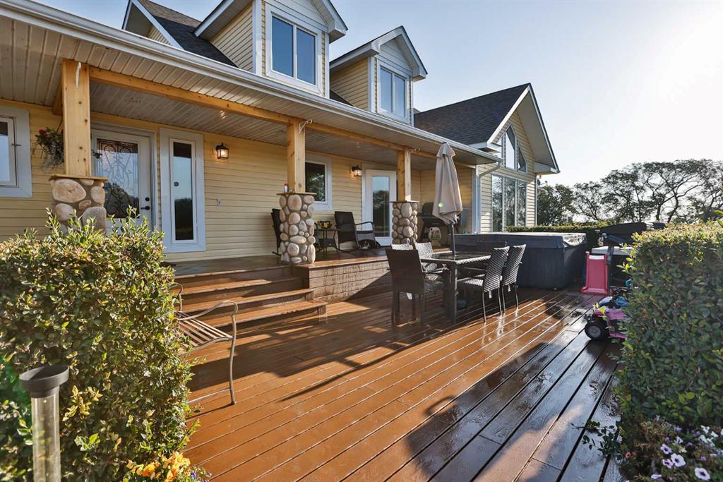 The kitchen is both functional and inviting, featuring custom knotty hickory cabinetry, granite countertops, a slate backsplash, and a large central island. Stainless steel appliances include a gas cooktop with electric oven, along with a new fridge and dishwasher (2024). A spacious dining area seamlessly connects to the kitchen and living room, with direct access to the covered veranda, composite decking and built in hot tub (2024) perfect for enjoying expansive prairie views.