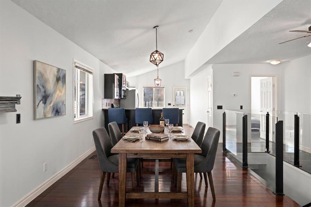 Step inside to a bright and open living room featuring vaulted ceilings, hardwood flooring, and a cozy fireplace with mantle, creating a warm and welcoming atmosphere. The adjoining dining area is ideal for entertaining, while the home has been recently painted and enhanced with modern glass railings for a stylish, contemporary feel.