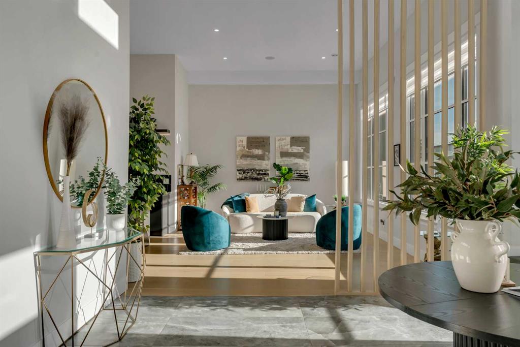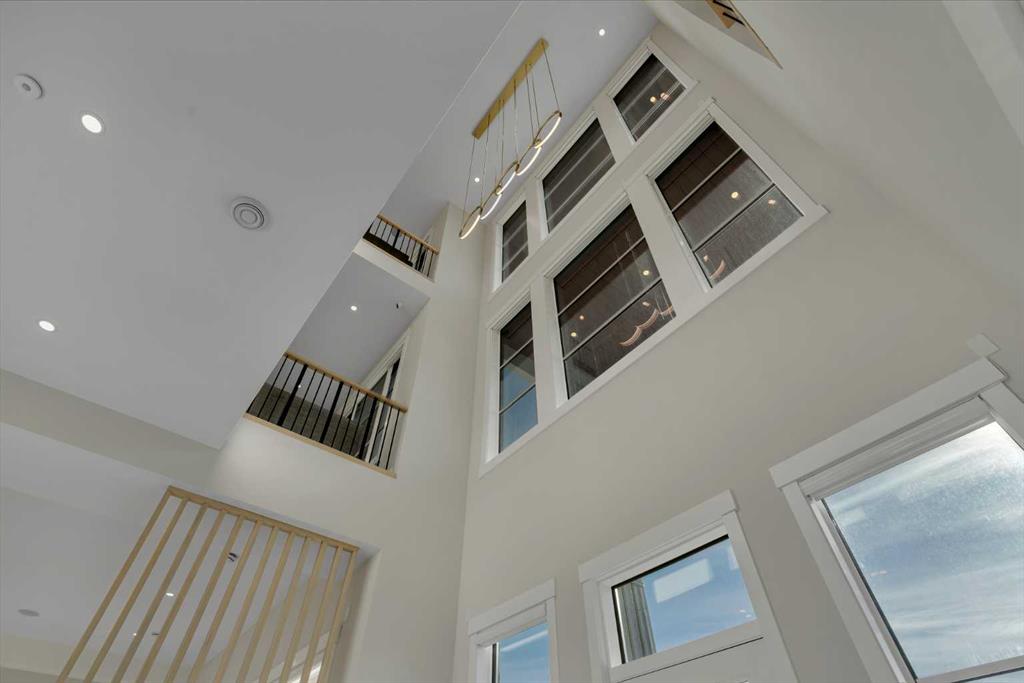 As you step inside you are greeted by a spectacular open-to-below foyer soaring approximately 30 feet, creating a rare sense of scale and elegance. Thoughtfully designed for both relaxation and upscale entertaining, this home features an elegant lounge with soaring 14-foot ceilings, built-in speakers, and ambient lighting that enhances the refined atmosphere. A custom-designed bar with sleek stone countertops, gold hardware, and backlit shelving serves as a true showpiece. This level also offers a private den, dedicated gym, fully equipped home theatre, and a spacious bedroom with a walk-in closet and full bathroom.