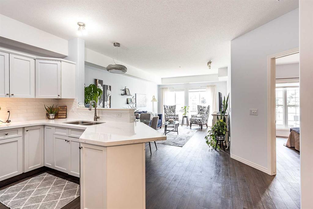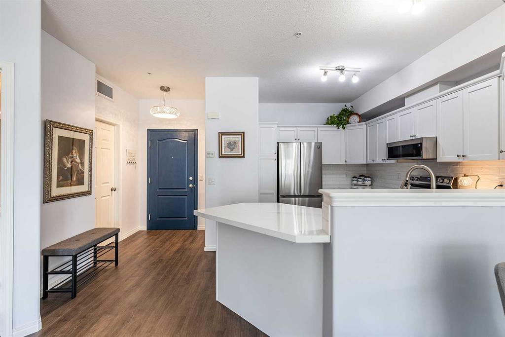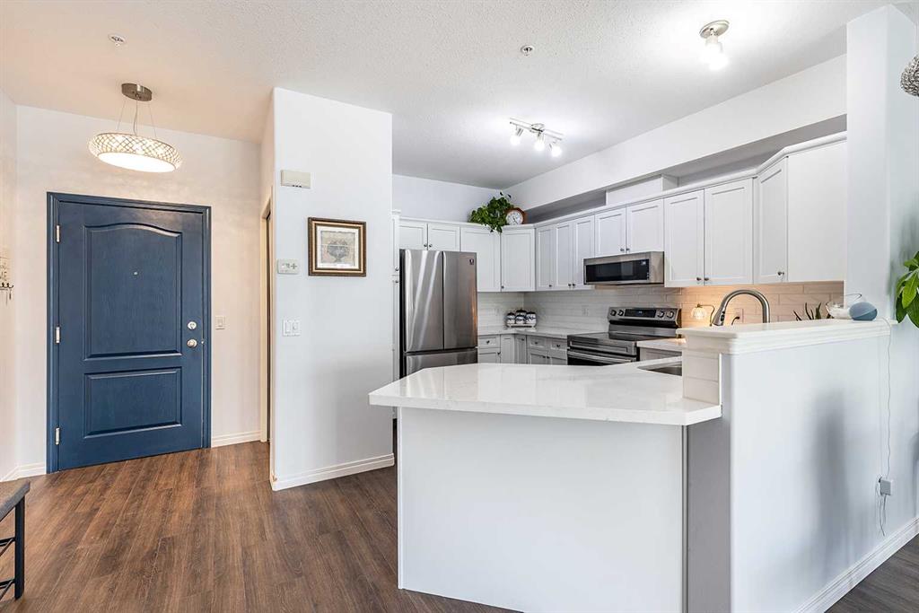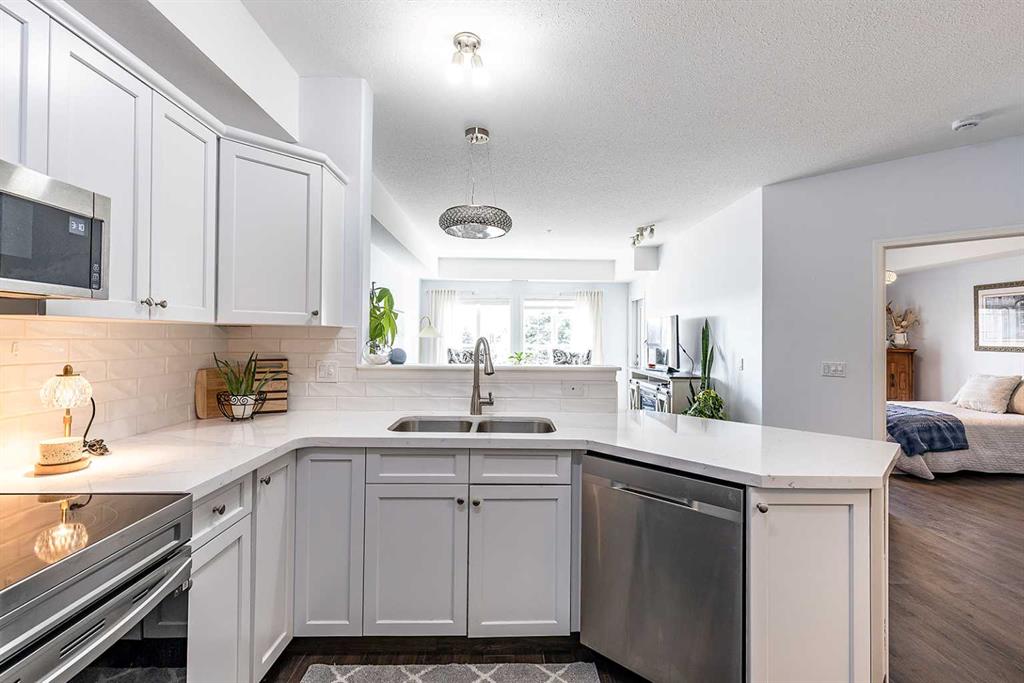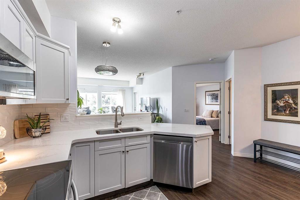 Enjoy condo living at its finest, in this updated unit with underground parking. There’s an easy kind of comfort in this bright condo that you notice from the moment you step inside. Sunlight pours through the large windows, illuminating the stylish vinyl plank flooring that runs cohesively throughout. The space immediately feels open, calm, and welcoming. The kitchen is stunning, with quartz countertops, white tile backsplash, updated cabinetry, and a full stainless steel appliance package. Enjoy a peaceful VIEW OF THE RIVER and of the lush courtyard from the living room and balcony.