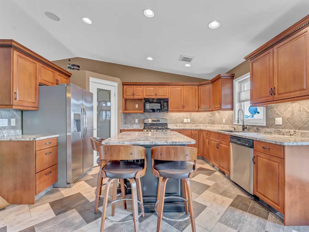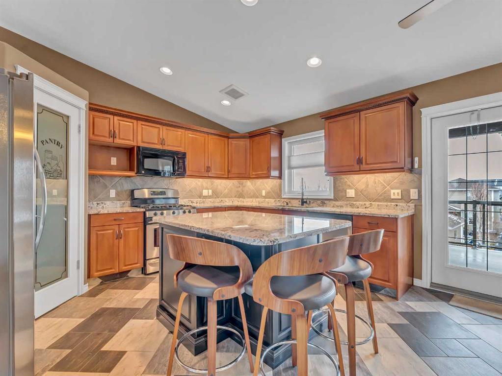 The main floor features a bright, open layout highlighted by large windows that flood the home with natural light. The upgraded kitchen by Wood Visions is a standout, complete with stunning granite countertops, a corner pantry, and ample cabinetry—perfect for both everyday living and entertaining. Elegant upgraded flooring flows through the front entry, kitchen, and living room, enhancing the home’s warm and inviting feel.
