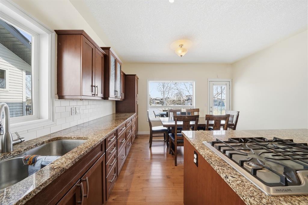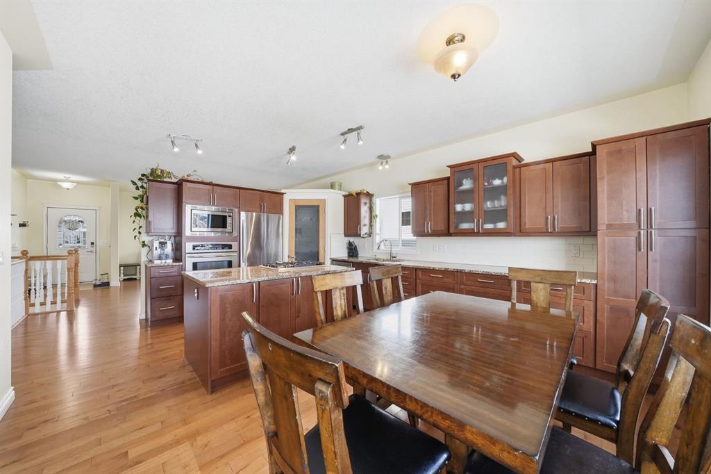 Welcome to this fully finished 4 bedroom, 3 bathroom walkout bungalow backing onto green space with a playground. This well-designed home offers 2 bedrooms up and 2 down, plus a dedicated office in the basement. The main floor features hardwood flooring and an oversized living room and kitchen area, complete with granite countertops, built-in oven and microwave, and a large island with countertop stove. The primary bedroom includes a spacious 4 piece ensuite, a great sized walk-in closet, and direct access to the full-width rear deck, which is also accessible from the kitchen, creating a great indoor-outdoor flow. The walkout basement opens to a poured concrete patio with a hot tub included, making the backyard space functional and private. This home is equipped with a solar system designed to significantly offset electricity costs, with current usage resulting in minimal to no power bills (details available). A great opportunity in a family-friendly location with direct access to green space.