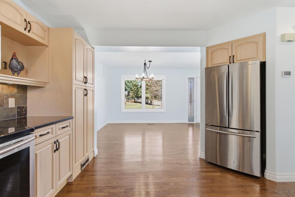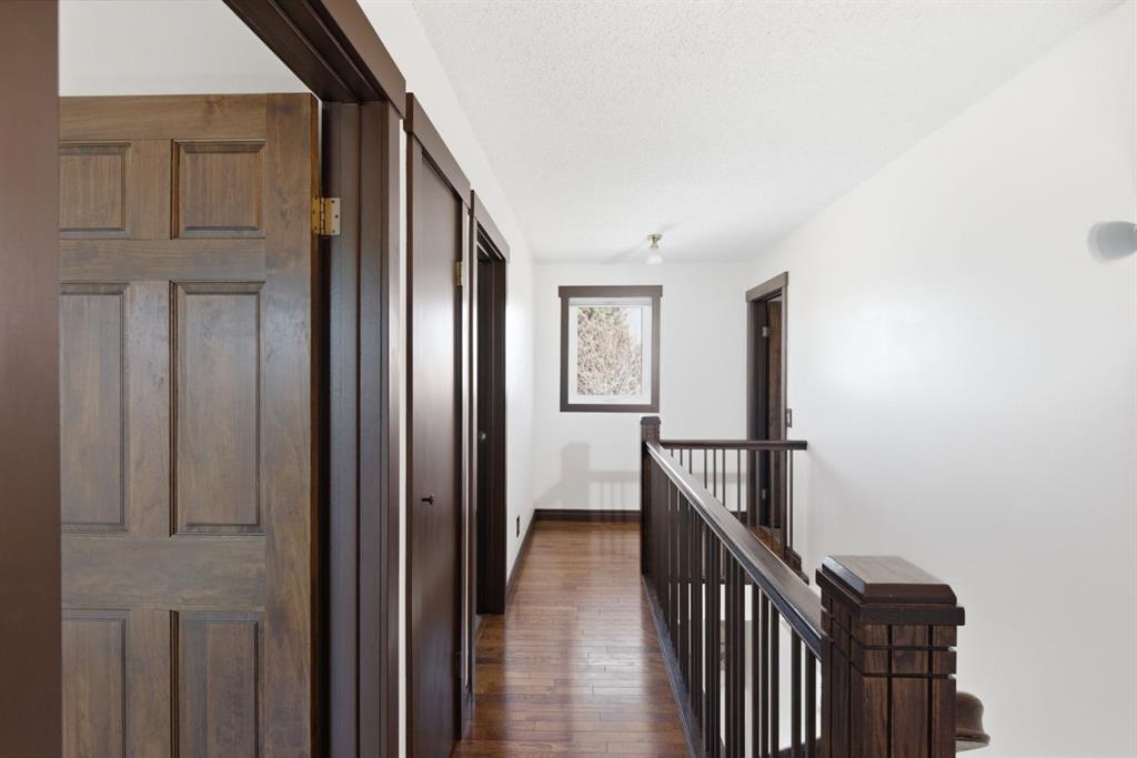 A thoughtfully, well-designed two-storey home with numerous improvements and upgrades is now available in the very desirable SE community of Bonavista Downs. This is a unique home in that it features two garages. The first is a front-facing, single (21’x12’), attached, insulated and heated garage with upgraded wiring, and finished interior which includes shelving. The front rubber-paved driveway offers additional parking. The second is an oversized double (25’ x 28’), heated, detached garage accessed from the paved alley, and has a finished interior which includes shelving, cabinets, and a workbench and is wired for 220 volts. Three bedrooms, 3.5 baths and 2,250 sq. ft. of living space on three levels. Upon entering the tiled foyer, the natural light flowing in from the upgraded triple pane windows on all sides is remarkable. Motorized window blinds allow you to control the light factor. The main floor is comprised of living room, dining room and kitchen and has warm hard wood floors throughout. To the left is the living room with woodburning, stone surround fireplace and enough space to experiment with various furniture configurations. The rear deck is accessed via French doors in the living room. To the right of the foyer is the dining room with ample room for entertainment and is adjacent to the kitchen. Cream cabinetry and plenty of it in the kitchen is a beautiful contrast to the dark granite countertops and tiled backsplash. Gleaming stainless appliances and a pantry add to the efficiency. A 2-pc. bath completes the main level. Moving upstairs, there is a combination of hardwood and laminate flooring. The primary bedroom is large and sunny with the benefit of a newly added walk-through closet and 4-pc. ensuite (double vanity). Two additional bedrooms, both with generous-sized closets, share a 4-pc. bath. The basement has been attractively finished and features a large, carpeted rec room with a second woodburning fireplace (both fireplaces passed WETT inspection in 2023). Across from the rec room is a tiled home office and tucked back of that is the laundry room with upgraded plumbing, venting and wiring; storage area and an upgraded 3-pc. bath. The house, attached garage and detached garage all have well-insulated (R40) attics. In 2023 the furnace was upgraded to a high-efficiency model with smart thermostat, a tankless water heater was installed and the humidifier was replaced. Both front and back yards are landscaped with lawn and mature trees. The back yard is fenced and has sprinklers installed. A bonus is your own hot tub. Well situated and close to Stoney, Deerfoot and Macleod Trails and Anderson Road. Proximity to shops and restaurants on both Macleod Trail and 130th Avenue; the Bow River; numerous schools (public and Catholic); churches; playgrounds; dog parks; Fish Creek Provincial Park and South Health Campus. This home has obviously been well tended as evidenced by the many upgrades and enhancements. Don\'t miss out on this outstanding opportunity.