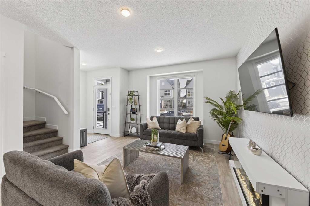 End-unit townhouse with double garage and modern finishes - this is the one you’ve been waiting for! Bright, open-concept main floor featuring wide-plank flooring, large windows, and a spacious living room with a sleek feature wall.