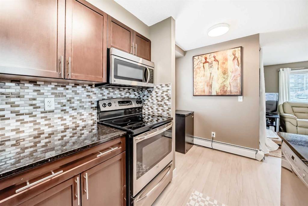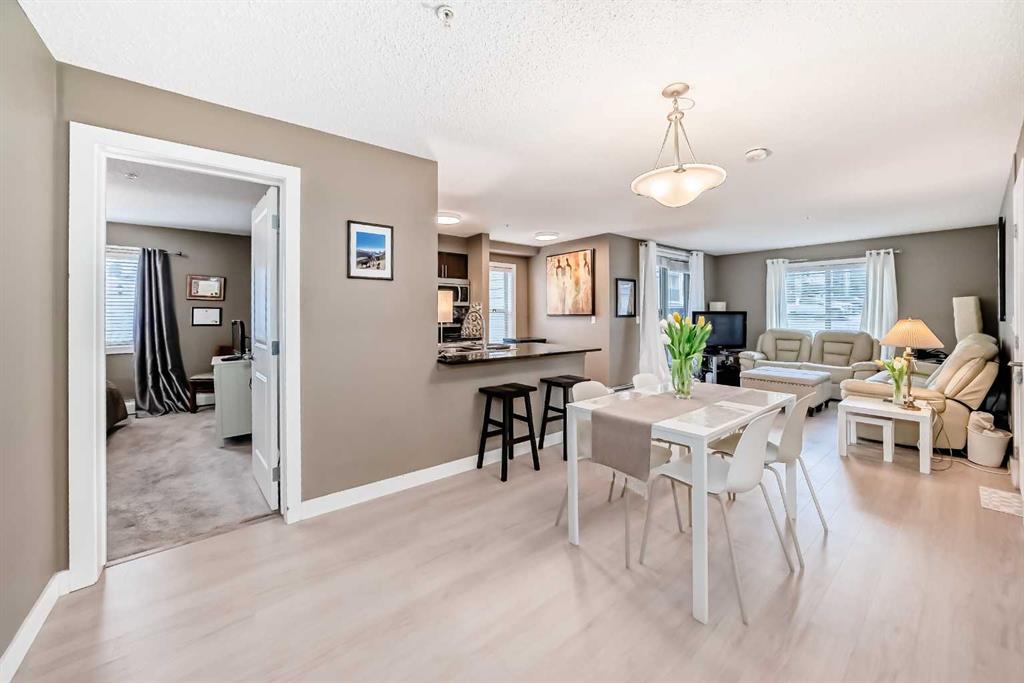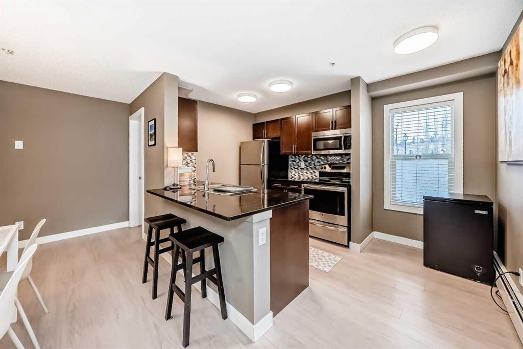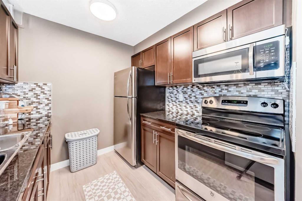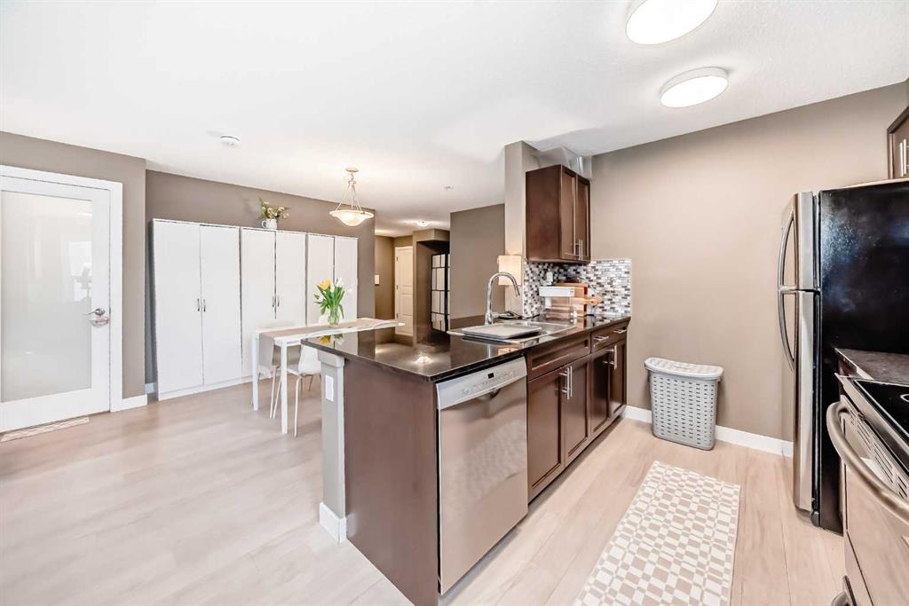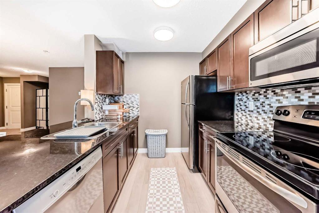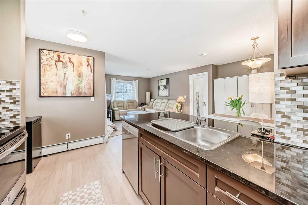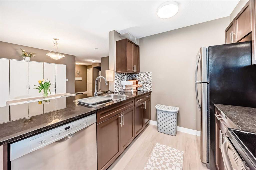Welcome to this beautifully maintained corner ground floor apartment in the heart of Glenbow, Cochrane, offering a functional layout and exceptional convenience. This bright and inviting home features 2 bedrooms and 2 bathrooms, perfect for first time buyers, downsizers, or investors. The well appointed kitchen showcases stainless steel appliances including a new Bosch dishwasher, granite countertops, tile backsplash, ample cabinetry, and a convenient breakfast bar. New lighting throughout the home enhances the modern feel, while the spacious primary bedroom offers a walk through closet leading to a private 3 piece ensuite complete with granite countertops. A second bedroom and a full 4 piece bathroom provide flexibility for guests, family, or a home office. Both bathrooms have been updated with new shower heads. An in suite laundry room with additional storage adds everyday practicality, while the welcoming front entry features a full size coat closet. Ground floor access makes this home especially appealing for those seeking a no stairs lifestyle. This unit includes one titled underground parking stall (#291) and one assigned surface stall (#139). Ideally located just steps from Cochrane’s restaurants, coffee shops, grocery stores, parks and walking paths.