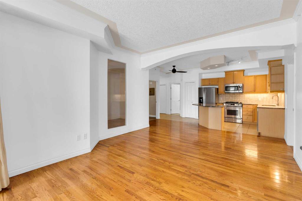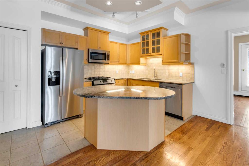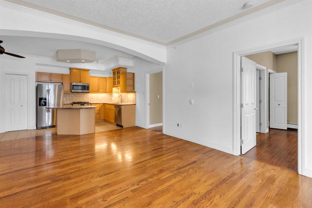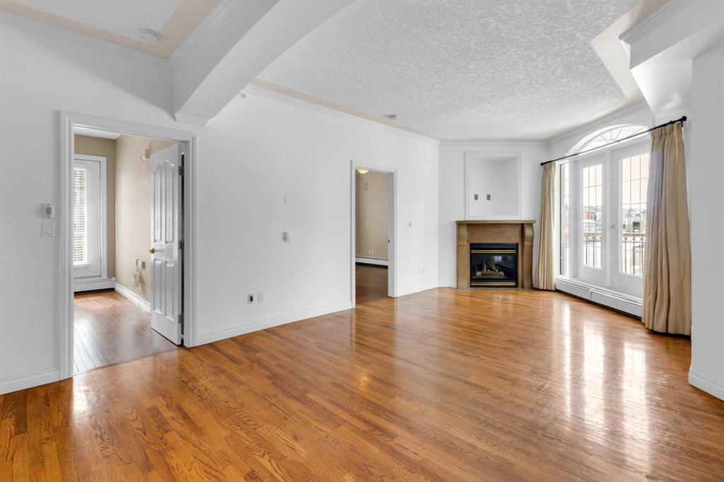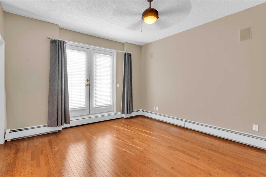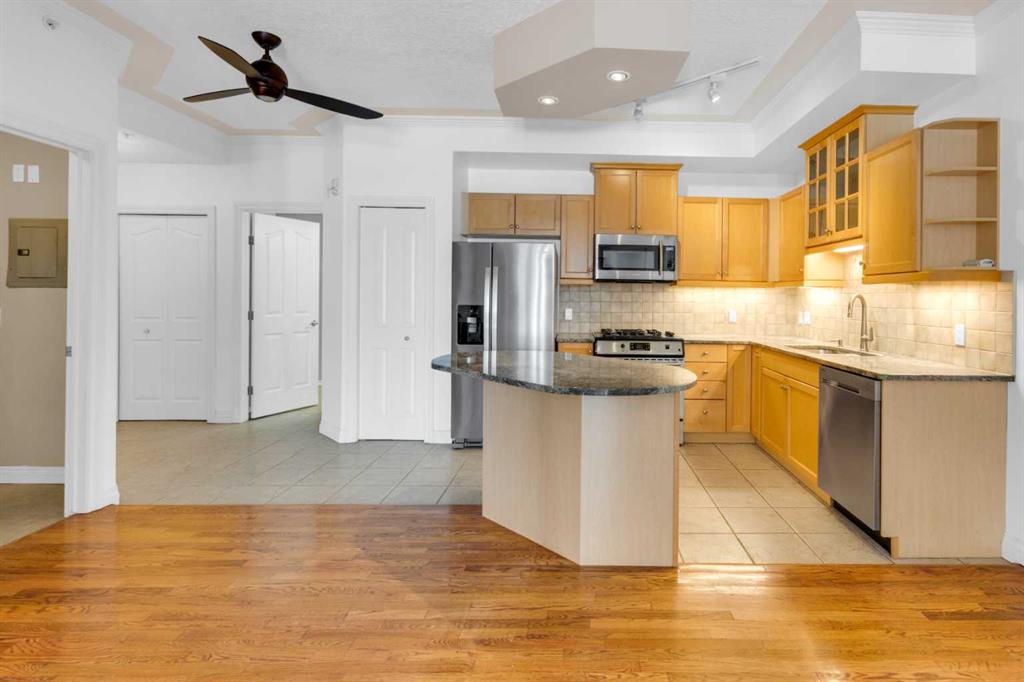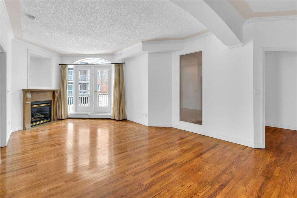 Welcome to unit #205 in The Monaco. This very well maintained 2 bedroom 2 bathroom + den unit is just under 1000 square feet and one the largest units in the building. Featuring a wide open living area anchored by a architectural surround mantled corner fireplace and french doors to the spacious balcony. The main areas are bright and have immaculate hardwood flooring and the entire unit is lightly lived in and well cared for. The open kitchen features a gas range, stainless steel appliances, ceramic tile flooring, ample cupboard space, separate pantry and granite counters with an eating island all over looking the main living and dining areas, perfect for entertaining. Adjacent to the dining area is the den/flex room - a great bonus space and can easily be used for a home office or work out area. Large primary bedroom has a 4 piece ensuite with a deep spa like jetted soaker tub and walk in closet with built-ins. Second bedroom is a nice size with a Juliet balcony and perfect for guests or roommate. Just off the kitchen is the additional 3 piece bathroom and separate laundry room with a stacked washer & dryer and additional storage space with shelving. The large 74 square foot balcony has a gas bbq and is an extension of the living area in seasonal weather, an excellent retreat. The Monaco is a low density full concrete building in a perfect central location close to all shopping, the Co-op Central Market, many interesting restaurants, pubs and within walking distance to energetic 17th Avenue and The Core. One titled parking stall completes the package - this unit is amazing value in the Beltline and ready for a new owner.