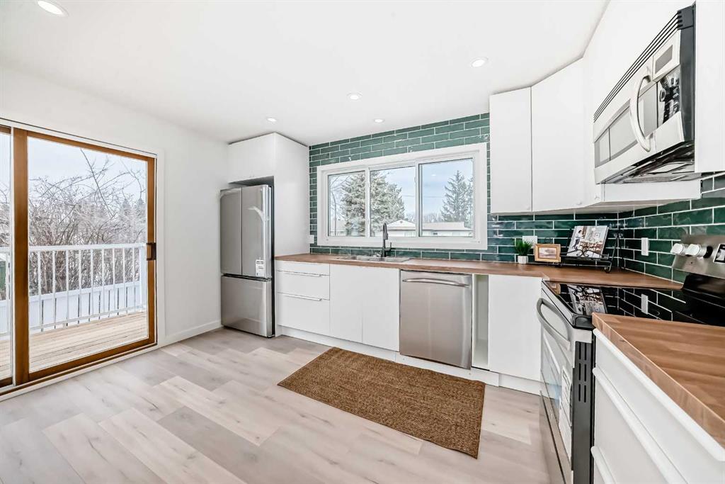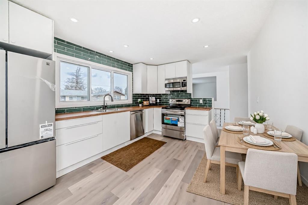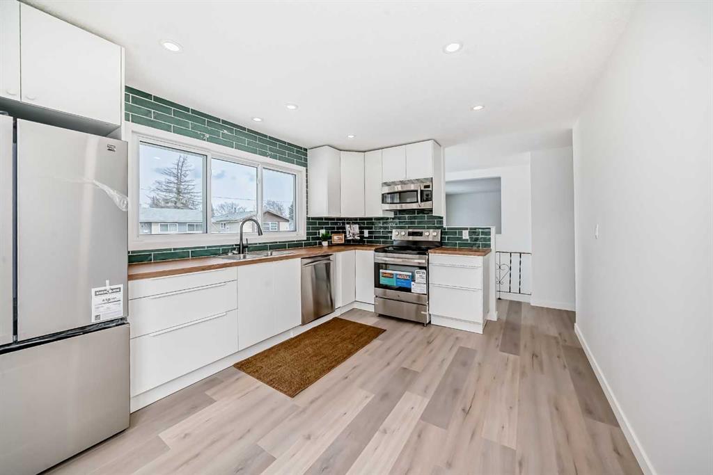 Inside, the home has been fully transformed with upgraded laminate flooring throughout, including the stairs with custom nosing.. The bright, modern kitchen featuring new cabinetry with soft close hinges, full tile backsplash, stainless appliances, a vented convection microwave, and a clean, functional layout ideal for everyday living and hosting.