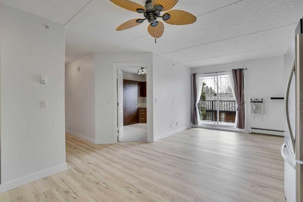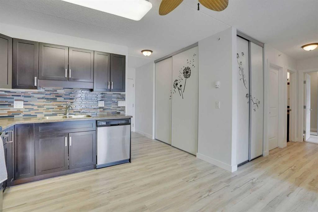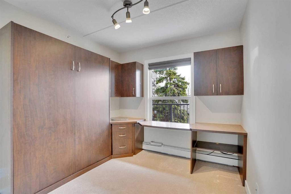 Step inside to discover fresh paint and new luxury vinyl plank flooring throughout the kitchen, living area, and hallway, creating a clean, durable, and stylish living space. The functional layout features a spacious living area, a well-appointed kitchen, and two generously sized bedrooms. The second bedroom includes a Murphy bed and desk, originally priced at over $4,000, adding both flexibility and value to the space.