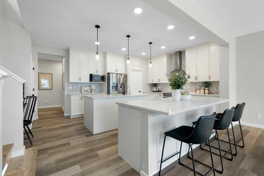 The main floor showcases a bright, open-concept layout designed for both everyday living and entertaining. The kitchen is a true standout with two oversized islands, quartz countertops, ceiling-height cabinetry, and a walk-through pantry connecting to the mudroom and garage. The adjacent dining and living areas create a seamless flow, enhanced by modern finishes and durable luxury vinyl plank flooring throughout.
