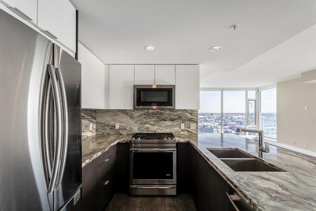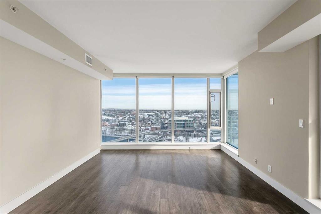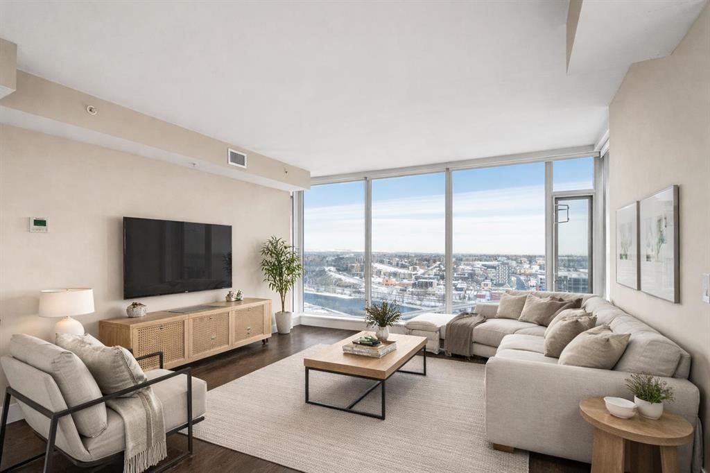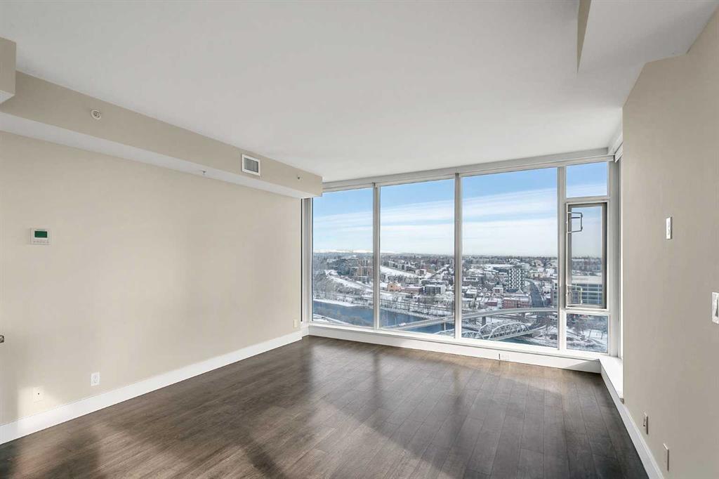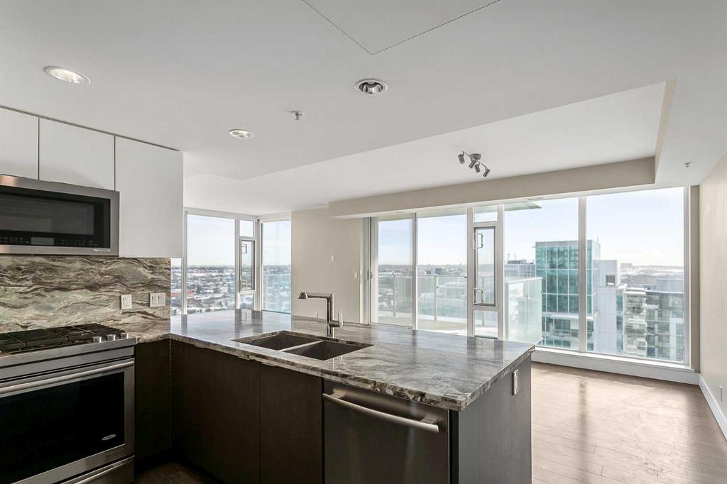Welcome to the 21st floor of Evolution, where elevated living meets modern design in the heart of the city. This spacious 1,121 sqft unit offers a functional layout with a versatile front den that is perfect for a home office or flex space and the convenience of in-suite laundry. The kitchen is thoughtfully designed with granite countertops and a full-height granite backsplash, under-cabinet lighting, two-toned cabinetry, and a eating bar. The dining area is bathed in natural light, while the expansive living room offers flexibility to accommodate a variety of furniture options. Enjoy stunning northeast-facing views of the Bow River, along with breathtaking sunrises that fill the home with natural light creating a bright and inviting atmosphere throughout the day. The primary bedroom features a walkthrough closet leading to a stunning 5-piece ensuite complete with heated floors, dual sinks, granite countertops, a soaker tub, and a 10mm glass shower. The second bedroom is generously sized with ample closet space, and the additional 3-piece bathroom also includes heated floors, granite counters, and a 10mm glass shower. Residents of Evolution enjoy premium amenities located on the second floor, including a fully equipped fitness centre, sauna, party room, and rooftop patio. This unit includes one assigned underground parking stall and a storage locker.