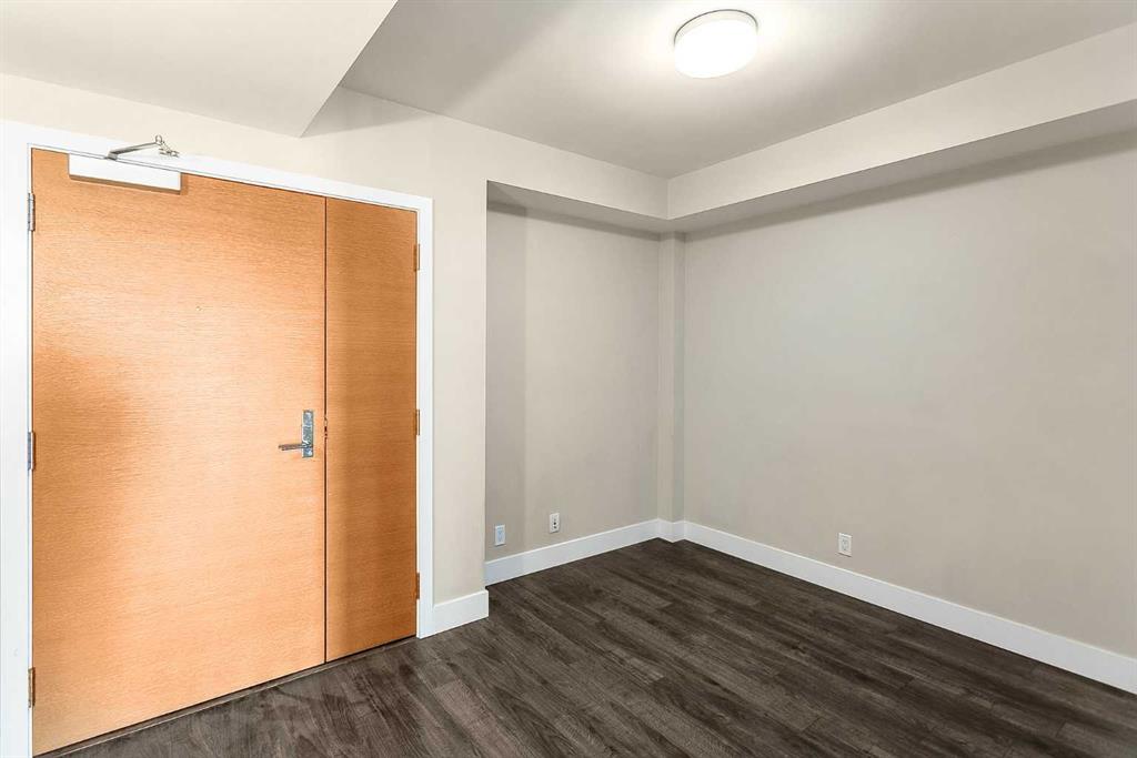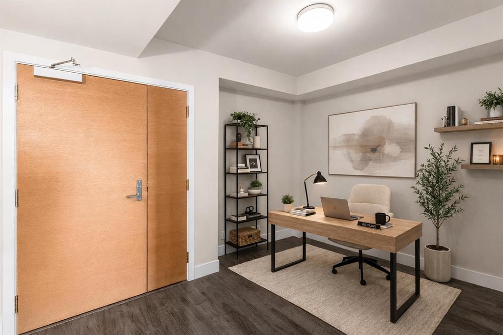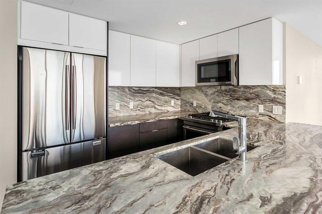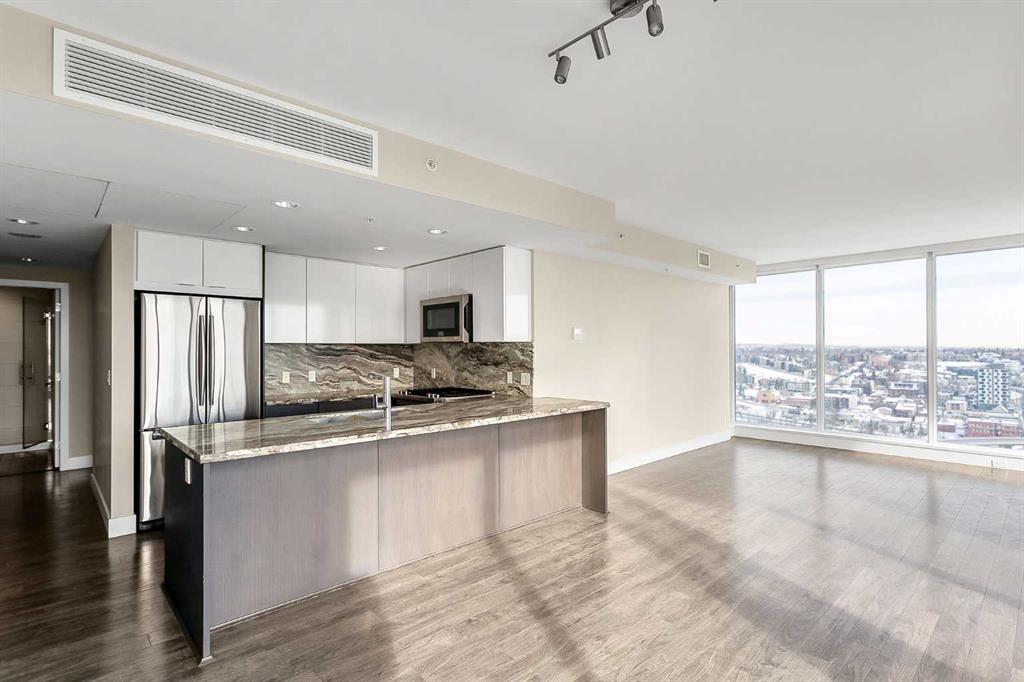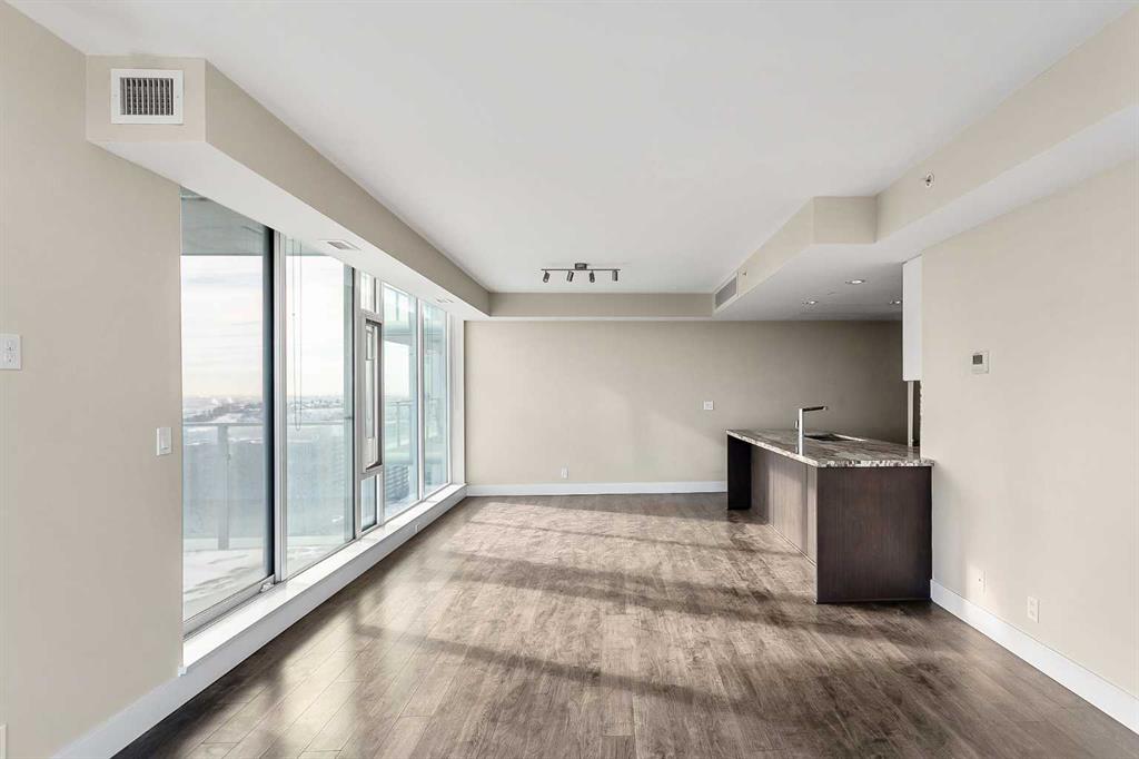 Welcome to the 21st floor of Evolution, where elevated living meets modern design in the heart of the city. This spacious 1,121 sqft unit offers a functional layout with a versatile front den that is perfect for a home office or flex space and the convenience of in-suite laundry. The kitchen is thoughtfully designed with granite countertops and a full-height granite backsplash, under-cabinet lighting, two-toned cabinetry, and a eating bar. The dining area is bathed in natural light, while the expansive living room offers flexibility to accommodate a variety of furniture options. Enjoy stunning northeast-facing views of the Bow River, along with breathtaking sunrises that fill the home with natural light creating a bright and inviting atmosphere throughout the day. The primary bedroom features a walkthrough closet leading to a stunning 5-piece ensuite complete with heated floors, dual sinks, granite countertops, a soaker tub, and a 10mm glass shower. The second bedroom is generously sized with ample closet space, and the additional 3-piece bathroom also includes heated floors, granite counters, and a 10mm glass shower. Residents of Evolution enjoy premium amenities located on the second floor, including a fully equipped fitness centre, sauna, party room, and rooftop patio. This unit includes one assigned underground parking stall and a storage locker.