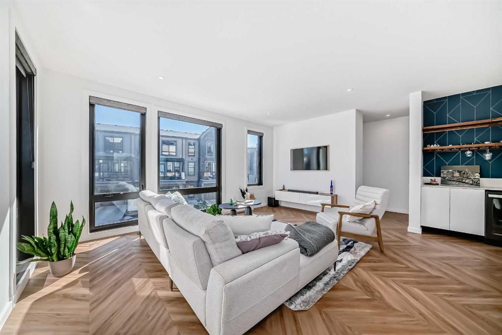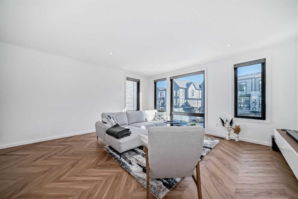 The main level impresses with floor-to-ceiling windows, front facing East for early morning sun and West facing back for sunsets. An open-concept layout, and a stunning kitchen complete with Quartz countertops, oversized island, and premium stainless steel appliances. Very spacious living and dining areas, vinyl flooring, and contemporary finishes throughout, creating a bright and inviting atmosphere.