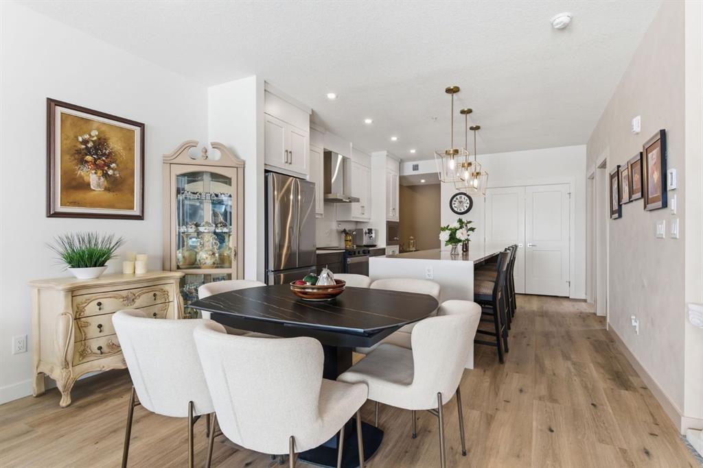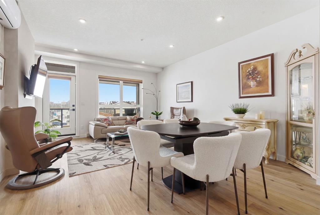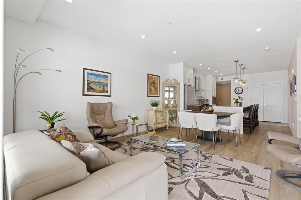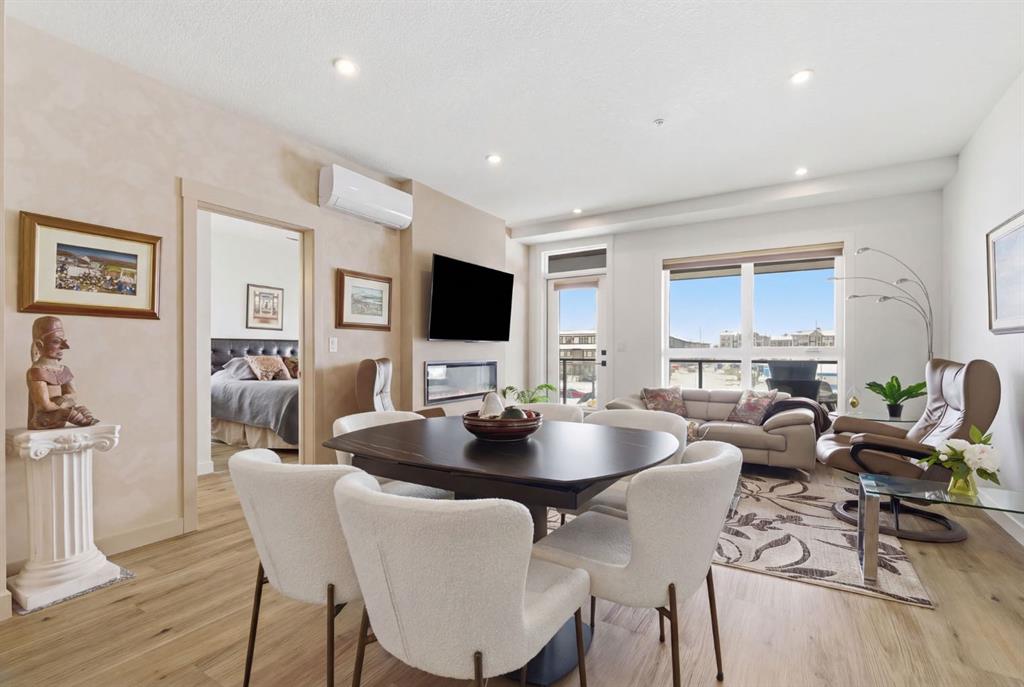 Welcome to this beautifully designed and upgraded, 3rd floor corner unit in the sought-after Waterside in Mahogany. Boasting nearly 1,000 sq ft of thoughtfully crafted living space, exceptional natural light from the south western exposure and large windows, and modern finishes throughout. From the moment you step inside, you’ll appreciate the spacious foyer and the bright and open layout that is enhanced by large dual pane, low-e southwest-facing windows that fill the home with beautiful sunshine all day long. Luxury vinyl plank flooring flows throughout the main living areas, creating a warm and inviting feel. The kitchen is both stylish and functional, hosting sleek quartz countertops, an upgraded stainless steel appliance package, elegant cabinetry with upgraded hardware and custom organization, and a stunning central island with waterfall ends, that provides plenty of space for cooking, dining, and entertaining. The open-concept design seamlessly connects the kitchen to the spacious living and dining areas, anchored by a contemporary electric fireplace for added comfort and ambiance. Step outside onto the oversized private balcony overlooking the courtyard area and is complete with a gas BBQ line, perfect for enjoy beautiful summer evenings on the patio. This well appointed Atwood 3 model suite offers two spacious bedrooms and 2 full baths. The primary bedroom features a generous walk-in closet with custom California Closets providing great storage options and a beautifully upgraded ensuite with a double vanity. Both bathrooms showcase quartz counters and upgraded fixtures, continuing the home’s luxurious, modern style. Additional highlights include in-unit laundry, 2 air conditioning wall units for year-round comfort, stylish upgraded lighting package throughout, and custom California Closets for exceptional organization. The home also includes a titled underground tandem parking stall to accommodate two vehicles and a separate storage locker, offering both convenience and extra space. Located in the award-winning community of Mahogany, residents enjoy exclusive access to Mahogany Lake, Calgary’s largest freshwater lake featuring sandy beaches, swimming, paddleboarding, skating in the winter, and endless pathways and wetlands for walking and biking and all your outdoor lifestyle needs. With numerous nearby shops, great restaurants including Chairmans Steakhouse, great schools, and amazing amenities just minutes away, Mahogany offers a vibrant, resort-style lifestyle in one of Calgary’s most desirable communities. This is condo living at its finest—modern, low maintenance, and surrounded by incredible amenities. Don\'t miss your chance to see this one today!