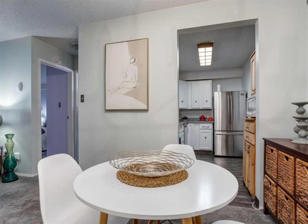 RARE OPPORTUNITY TO OWN AN UPDATED 1 BED IN A HIDDEN GEM LOCATION! Amenities include a gym, tennis and pickle ball courts, event room with full kitchen, shared library, indoor squash court, ping pong room, change rooms, playground and park areas, all for private residential use! Unique unit amenities include a huge storage room inside the unit that can easily fit a freezer and loads of storage, plus an exterior locked off storage room that is huge! Ideal for storing your winter tires or patio furniture. This main floor unit faces trees and a park and is quietly situated in the heart of the complex. Renovated with newer carpets and paint. Kitchen boasts higher end stainless stove and dishwasher, a French fridge and granite counters. The dining room is spacious. Huge living room with cozy corner wood fireplace (complex has decommissioned them but candles or electric inserts are permitted). Massive patio door lets in so much light. Cushy carpet was recently replaced. Master bedroom with double closet can easily fit a king sized bed. Bathroom has been updated with a modern vanity and tile details. Main floor means you can walk out of your patio right onto grass or even enter/exit the unit this way instead of through the building! Cats permitted, no dogs in the complex. Secure intercom access. Shared laundry on the second floor. One surface parking stall with plug in is included. Additional parking can be rented at $60.month from the management. DON\'T MISS OUT ON THIS GEM OF A UNIT LOADED WITH AMENITIES! Condo fee includes all amenities (gym, courts, part rooms) heat, water, and snow removal. Vacant possession available July 2, 2026. No short term rentals permitted.