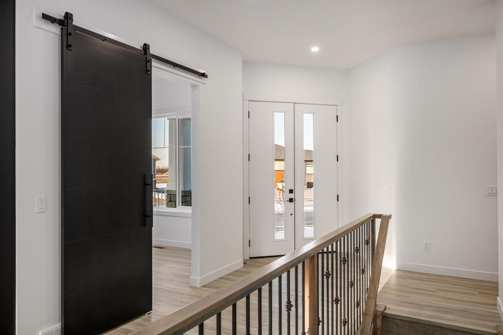 From the inviting front porch and stone-accented exterior, step into a bright entry where a spacious front office with three oversized windows and a custom sliding barn door is perfectly positioned off the foyer—ideal for working from home or an additional bedroom.