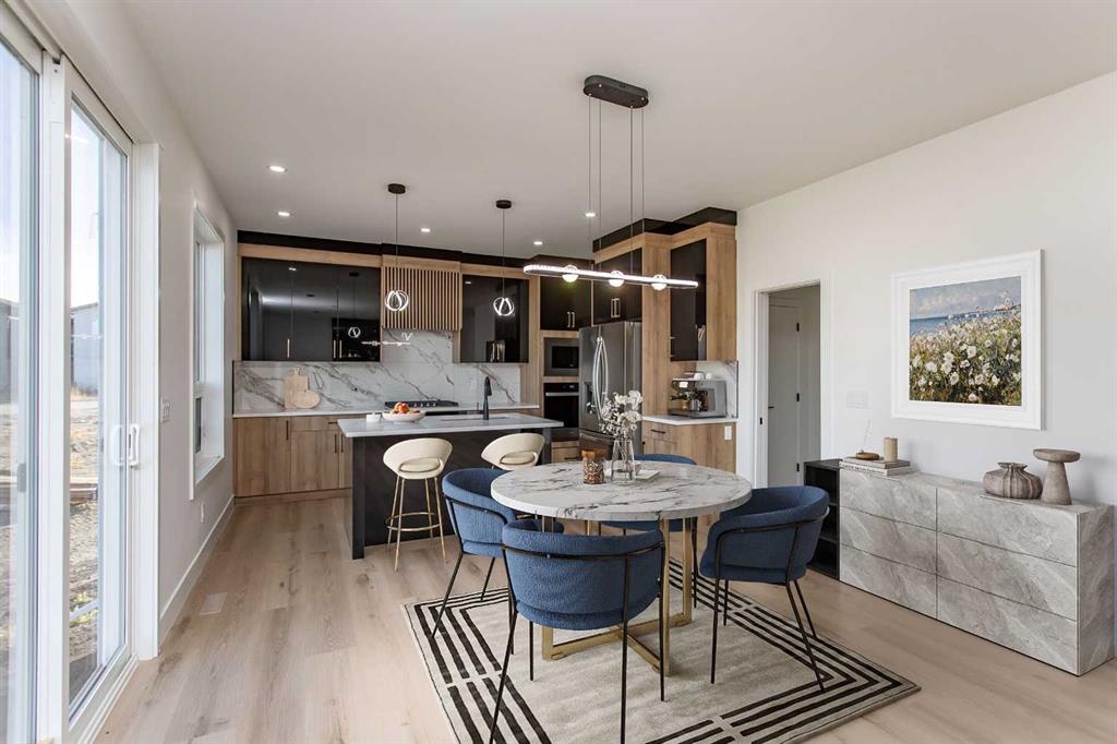 From the moment you step onto the covered front porch and through the oversized 8\' front door, the attention to detail is clear. Smooth painted flat ceilings flow throughout the home, while tall ceiling heights and a striking black metal and glass railing on the staircase add to the modern aesthetic. The open-concept main floor features durable tile and vinyl plank flooring, an electric fireplace, and large rear-facing windows that fill the space with natural light. The two-tone Kitchen is both beautiful and practical, with quartz countertops, a gas cooktop, built-in wall oven and microwave, and a spacious walk-in pantry. A main floor Office and 2 Piece Bath offer smart functionality for daily life.